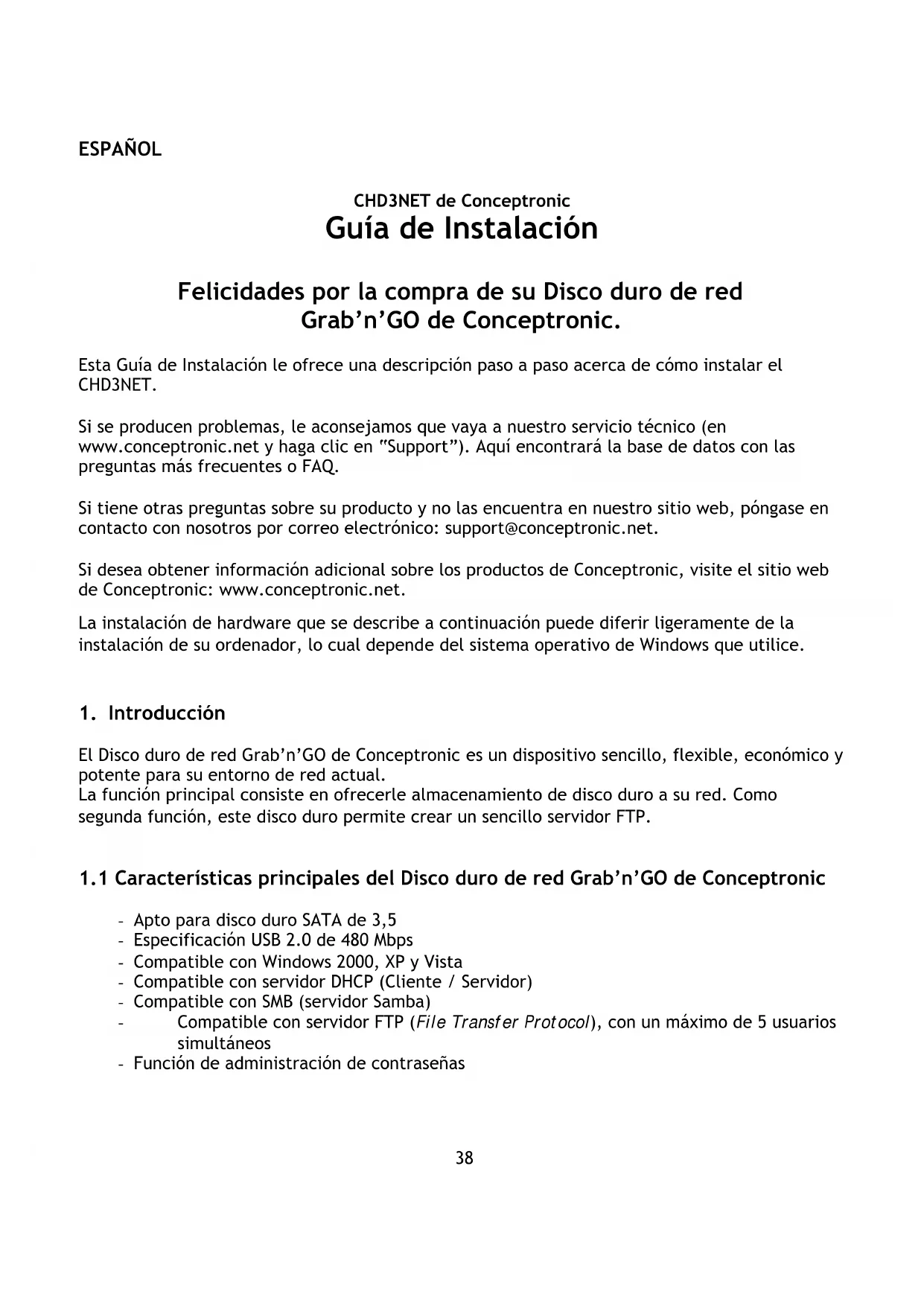 CHD3NET de Conceptronic Guía de Instalación Felicidades por la compra de su Disco duro de red Grab’n’GO de Conceptronic. Esta Guía de Instalación le ofrece una descripción paso a paso acerca de cómo instalar el CHD3NET. Si se producen problemas, le aconsejamos que vaya a nuestro servicio técnico (en www.conceptronic.net y haga clic en “Support”). Aquí encontrará la base de datos con las preguntas más frecuentes o FAQ. Si tiene otras preguntas sobre su producto y no las encuentra en nuestro sitio web, póngase en contacto con nosotros por correo electrónico: support@conceptronic.net. Si desea obtener información adicional sobre los productos de Conceptronic, visite el sitio web de Conceptronic: www.conceptronic.net. La instalación de hardware que se describe a continuación puede diferir ligeramente de la instalación de su ordenador, lo cual depende del sistema operativo de Windows que utilice.