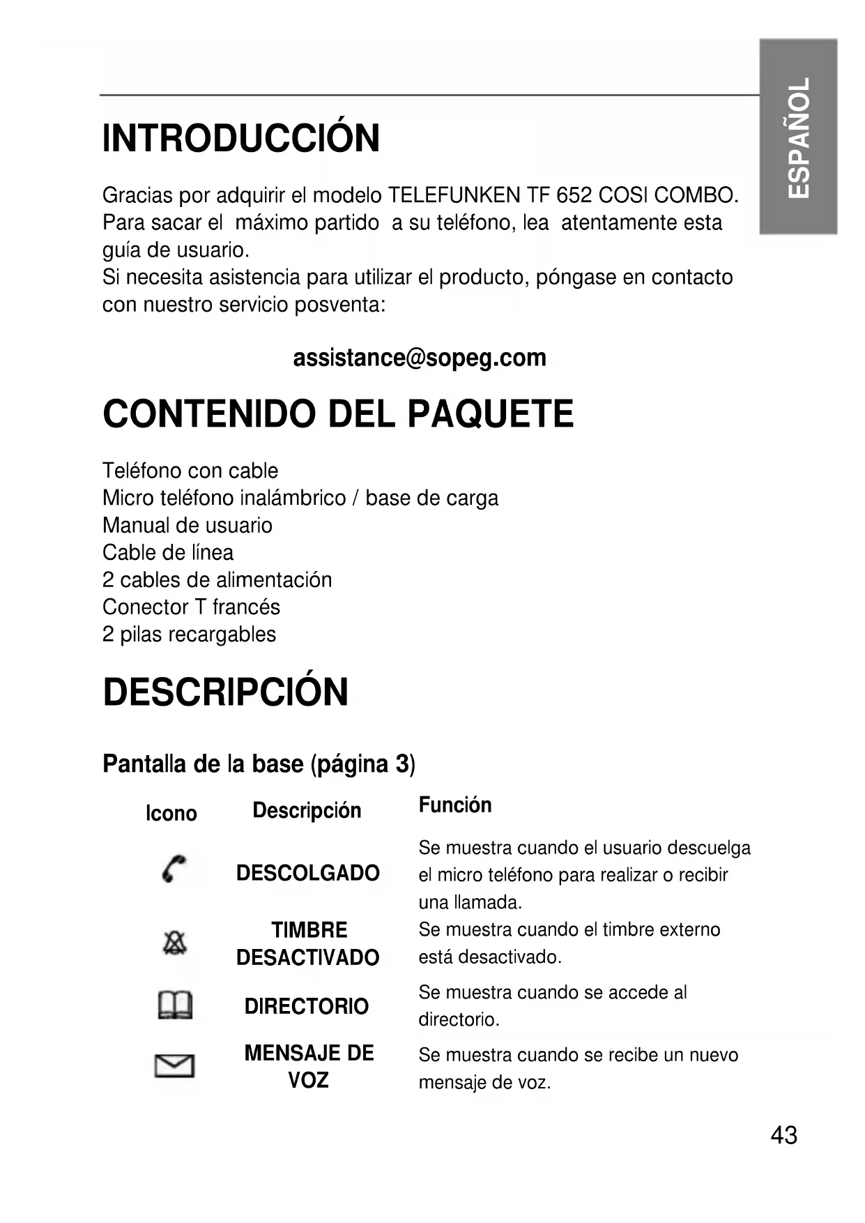 Teléfono con cable Micro teléfono inalámbrico / base de carga Manual de usuario Cable de línea 2 cables de alimentación Conector T francés 2 pilas recargables DESCRIPCIÓN Pantalla de la base (página 3) Icono Descripción Función DESCOLGADO Se muestra cuando el usuario descuelga el micro teléfono para realizar o recibir una llamada. TIMBRE DESACTIVADO Se muestra cuando el timbre externo está desactivado. DIRECTORIO Se muestra cuando se accede al directorio. MENSAJE DE VOZ Se muestra cuando se recibe un nuevo mensaje de voz.44 ESPAÑOL