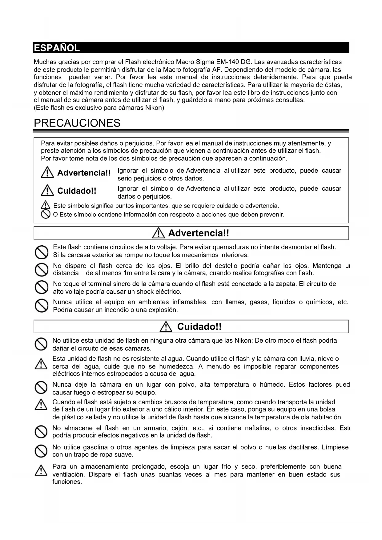 ESPAÑOL Muchas gracias por comprar el Flash electrónico Macro Sigma EM-140 DG. Las avanzadas características de este producto le permitirán disfrutar de la Macro fotografía AF. Dependiendo del modelo de cámara, las funciones pueden variar. Por favor lea este manual de instrucciones detenidamente. Para que pueda disfrutar de la fotografía, el flash tiene mucha variedad de características. Para utilizar la mayoría de éstas, y obtener el máximo rendimiento y disfrutar de su flash, por favor lea este libro de instrucciones junto con el manual de su cámara antes de utilizar el flash, y guárdelo a mano para próximas consultas. (Este flash es exclusivo para cámaras Nikon) PRECAUCIONES Para evitar posibles daños o perjuicios. Por favor lea el manual de instrucciones muy atentamente, y preste atención a los símbolos de precaución que vienen a continuación antes de utilizar el flash. Por favor tome nota de los dos símbolos de precaución que aparecen a continuación. Advertencia!! Cuidado!! Este símbolo significa puntos importantes, que se requiere cuidado o advertencia. O Este símbolo contiene información con respecto a acciones que deben prevenir. Ignorar el símbolo de Advertencia al utilizar este producto, puede causar serio perjuicios o otros daños. Ignorar el símbolo de Advertencia al utilizar este producto, puede causar daños o perjuicios.