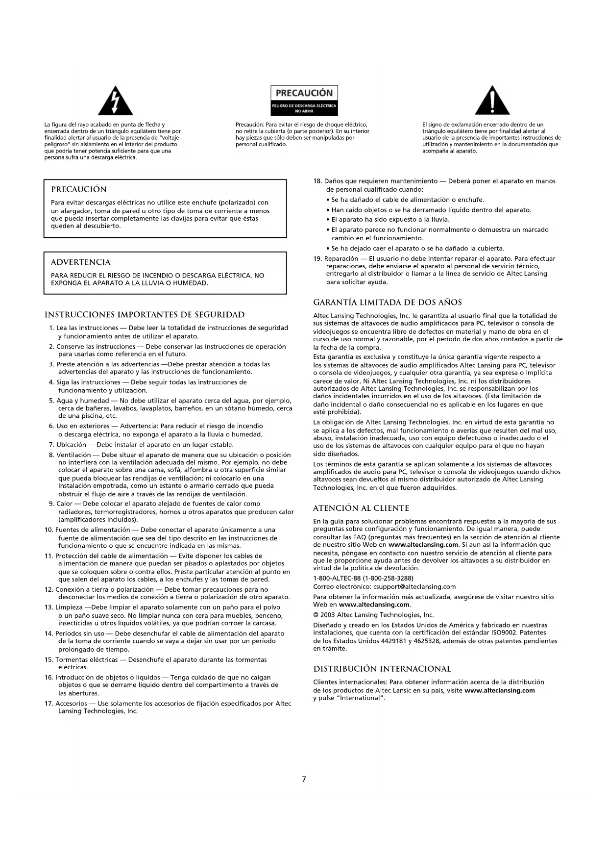 entregarlo al distribuidor o llamar a la línea de servicio de Altec Lansing