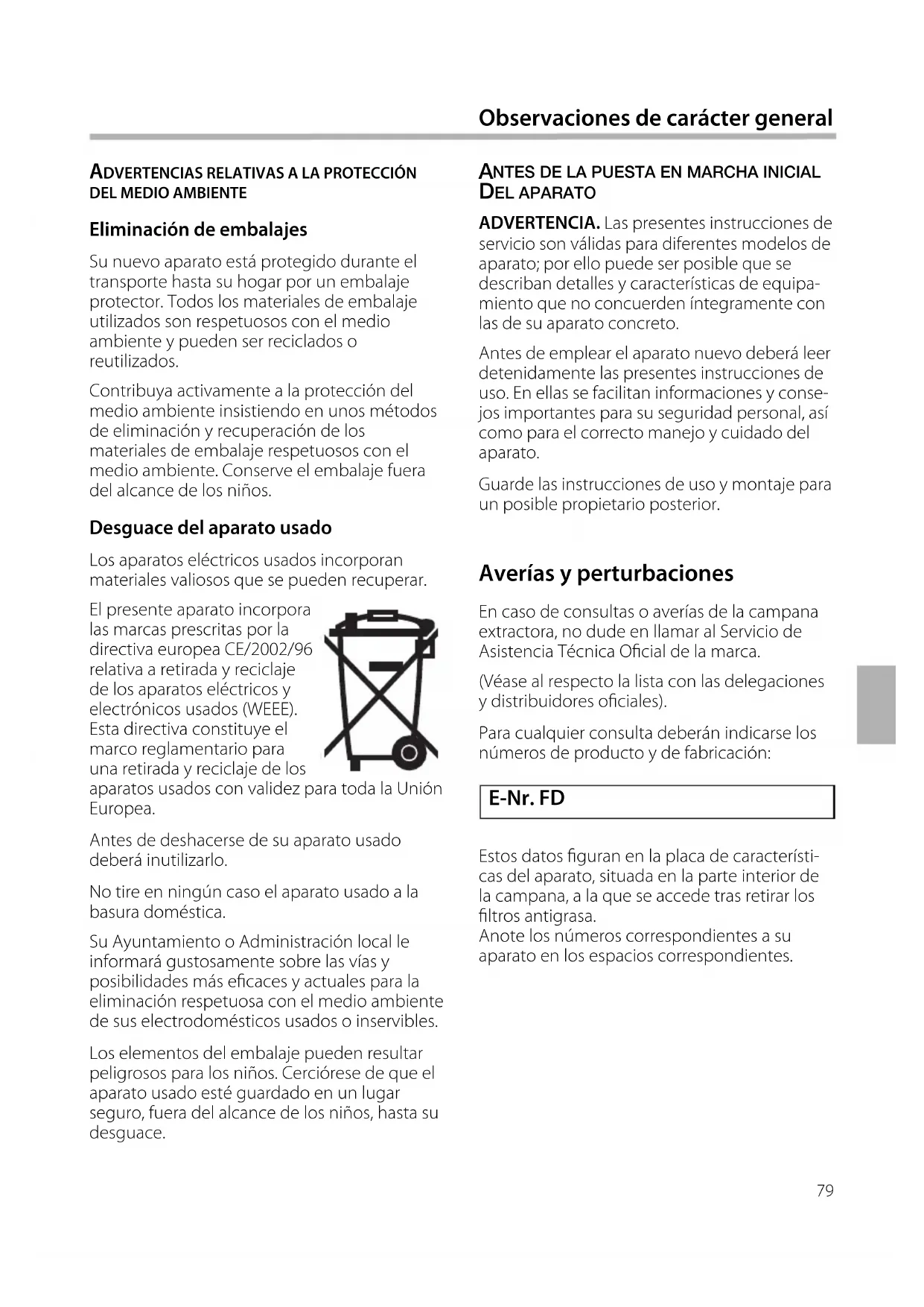 Eliminación de embalajes Su nuevo aparato está protegido durante el transporte hasta su hogar por un embalaje protector. Todos los materiales de embalaje utilizados son respetuosos con el medio ambiente y pueden ser reciclados o reutilizados. Contribuya activamente a la protección del medio ambiente insistiendo en unos métodos de eliminación y recuperación de los materiales de embalaje respetuosos con el medio ambiente. Conserve el embalaje fuera del alcance de los niños. Desguace del aparato usado Los aparatos eléctricos usados incorporan materiales valiosos que se pueden recuperar. El presente aparato incorpora las marcas prescritas por la directiva europea CE/2002/96 relativa a retirada y reciclaje de los aparatos eléctricos y electrónicos usados (WEEE). Esta directiva constituye el marco reglamentario para una retirada y reciclaje de los aparatos usados con validez para toda la Unión Europea. Antes de deshacerse de su aparato usado deberá inutilizarlo. No tire en ningún caso el aparato usado a la basura doméstica. Su Ayuntamiento o Administración local le informará gustosamente sobre las vías y posibilidades más ecaces y actuales para la eliminación respetuosa con el medio ambiente de sus electrodomésticos usados o inservibles. Los elementos del embalaje pueden resultar peligrosos para los niños. Cerciórese de que el aparato usado esté guardado en un lugar seguro, fuera del alcance de los niños, hasta su desguace. Averías y perturbaciones En caso de consultas o averías de la campana extractora, no dude en llamar al Servicio de Asistencia Técnica Ocial de la marca. (Véase al respecto la lista con las delegaciones y distribuidores ociales). Para cualquier consulta deberán indicarse los números de producto y de fabricación: Estos datos guran en la placa de característi- cas del aparato, situada en la parte interior de la campana, a la que se accede tras retirar los ltros antigrasa. Anote los números correspondientes a su aparato en los espacios correspondientes. Observaciones de carácter general80 Uso correcto del aparato