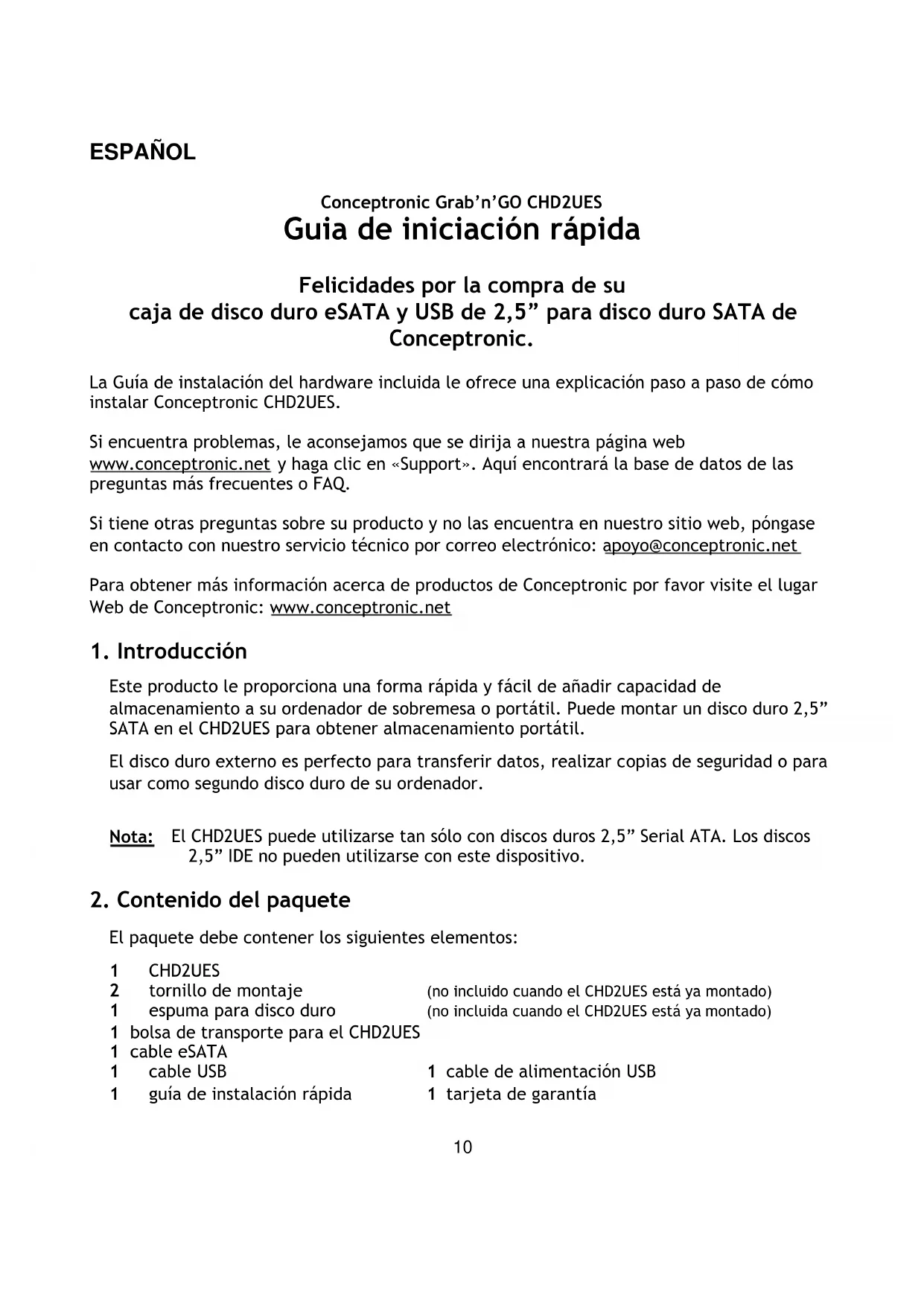 Felicidades por la compra de su caja de disco duro eSATA y USB de 2,5” para disco duro SATA de Conceptronic.