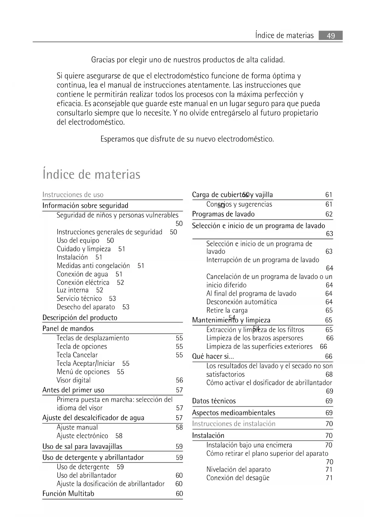 Instrucciones generales de seguridad 50 Uso del equipo 50 Cuidado y limpieza 51 Instalación 51 Medidas anti congelación 51 Conexión de agua 51 Conexión eléctrica 52 Luz interna 52 Servicio técnico 53 Desecho del aparato 53 Descripción del producto 54 Panel de mandos 54 Teclas de desplazamiento 55 Tecla de opciones 55 Tecla Cancelar 55 Tecla Aceptar/Iniciar 55 Menú de opciones 55 Visor digital 56 Antes del primer uso 57 Primera puesta en marcha: selección del idioma del visor 57 Ajuste del descalcificador de agua 57 Ajuste manual 58 Ajuste electrónico 58 Uso de sal para lavavajillas 59 Uso de detergente y abrillantador 59 Uso de detergente 59 Uso del abrillantador 60 Ajuste la dosificación de abrillantador 60 Función Multitab 60 Carga de cubiertos y vajilla 61 Consejos y sugerencias 61 Programas de lavado 62 Selección e inicio de un programa de lavado