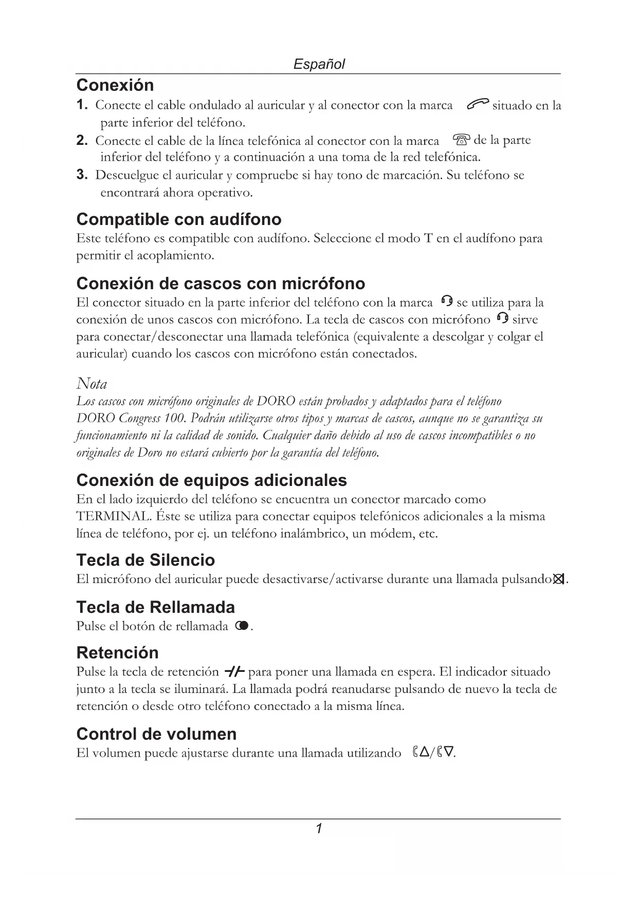 sirve para conectar/desconectar una llamada telefónica (equivalente a descolgar y colgar el auricular) cuando los cascos con micrófono están conectados. Nota Los cascos con micrófono originales de DORO están probados y adaptados para el teléfono DORO Congress 100. Podrán utilizarse otros tipos y marcas de cascos, aunque no se garantiza su funcionamiento ni la calidad de sonido. Cualquier daño debido al uso de cascos incompatibles o no originales de Doro no estará cubierto por la garantía del teléfono. Conexión de equipos adicionales En el lado izquierdo del teléfono se encuentra un conector marcado como TERMINAL. Éste se utiliza para conectar equipos telefónicos adicionales a la misma línea de teléfono, por ej. un teléfono inalámbrico, un módem, etc. Tecla de Silencio El micrófono del auricular puede desactivarse/activarse durante una llamada pulsando