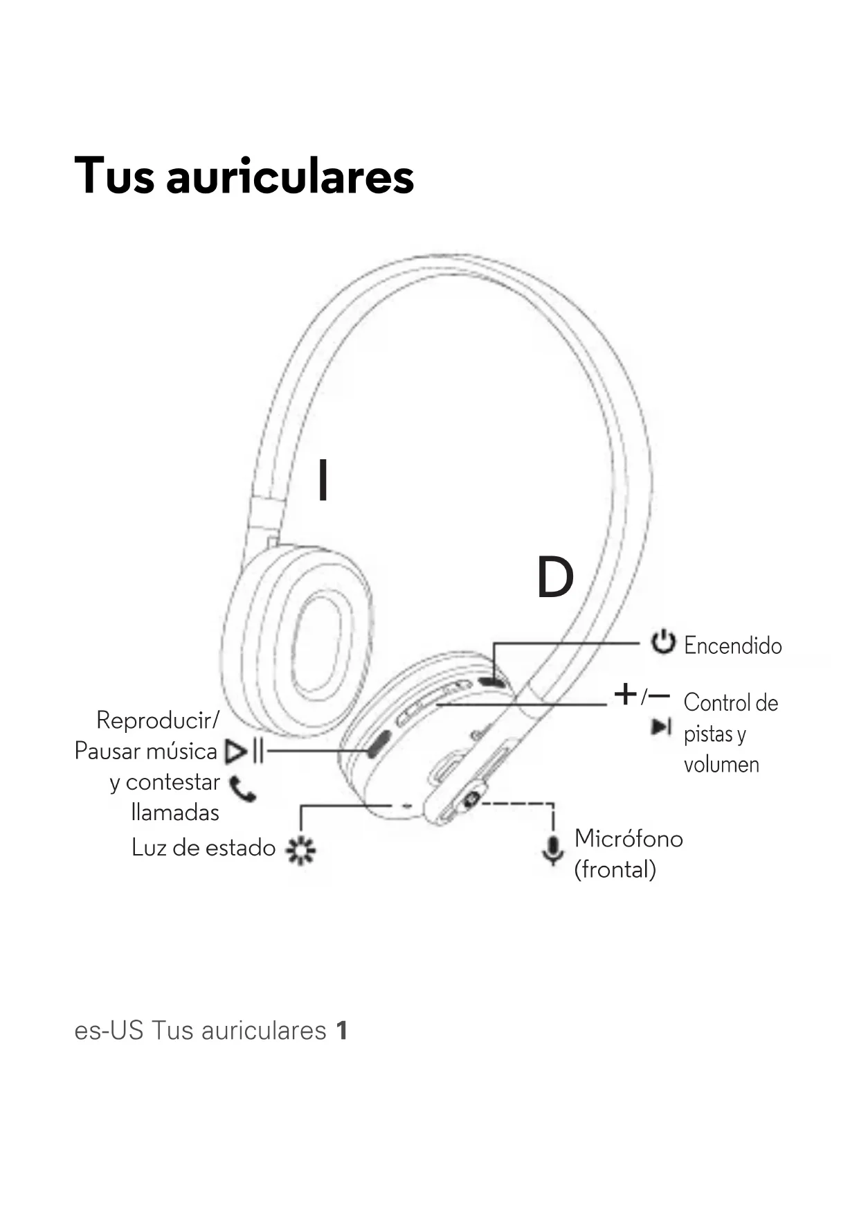 - Verde: alto, de 71 a 100 % Nota: La batería se diseñó para durar todo el ciclo de vida del producto. Solo debe ser retirada por un servicio de reciclaje. Cualquier intento de retirar o reemplazar de la batería puede causar daños al producto y anular la garantía. Presiona + y - juntos para vericar el nivel de carga (cuando no estés en una llamada).es-US Avanzado 11 Restablecer Desactiva Bluetooth para todos los dispositivos conectados. Enciende los auriculares, mantén presionado los tres botones hasta que la luz de estado cambie de rojo a azul y viceversa. Escucharás un tono. Mantén presionados estos tres botones para restablecer.12 Avanzado es-US Dispositivo secundario ¿Utilizas un teléfono o una tablet? Conéctate a ambos dispositivos al mismo tiempo. 1 Para vincular el primer dispositivo, sigue los pasos en “Vincula con Bluetooth™” en la página 5. 2 Desactiva Bluetooth en el primer dispositivo (el teléfono, la tablet o la computadora). 3 Apaga los auriculares. Vuelve a encenderlos. 4 Para vincular el segundo dispositivo, sigue los pasos en “Vincula con Bluetooth™” en la página 5. 5 En el primer dispositivo, vuelve a activar Bluetooth para conectarlo simultáneamente. Escucharás un tono cuando el primer dispositivo se conecte. Consejo: Para cambiar y reproducir audio desde el segundo dispositivo conectado, presiona pausa en el primer dispositivo y presiona "reproducir" en el segundo.es-US Ayuda 13 Ayuda