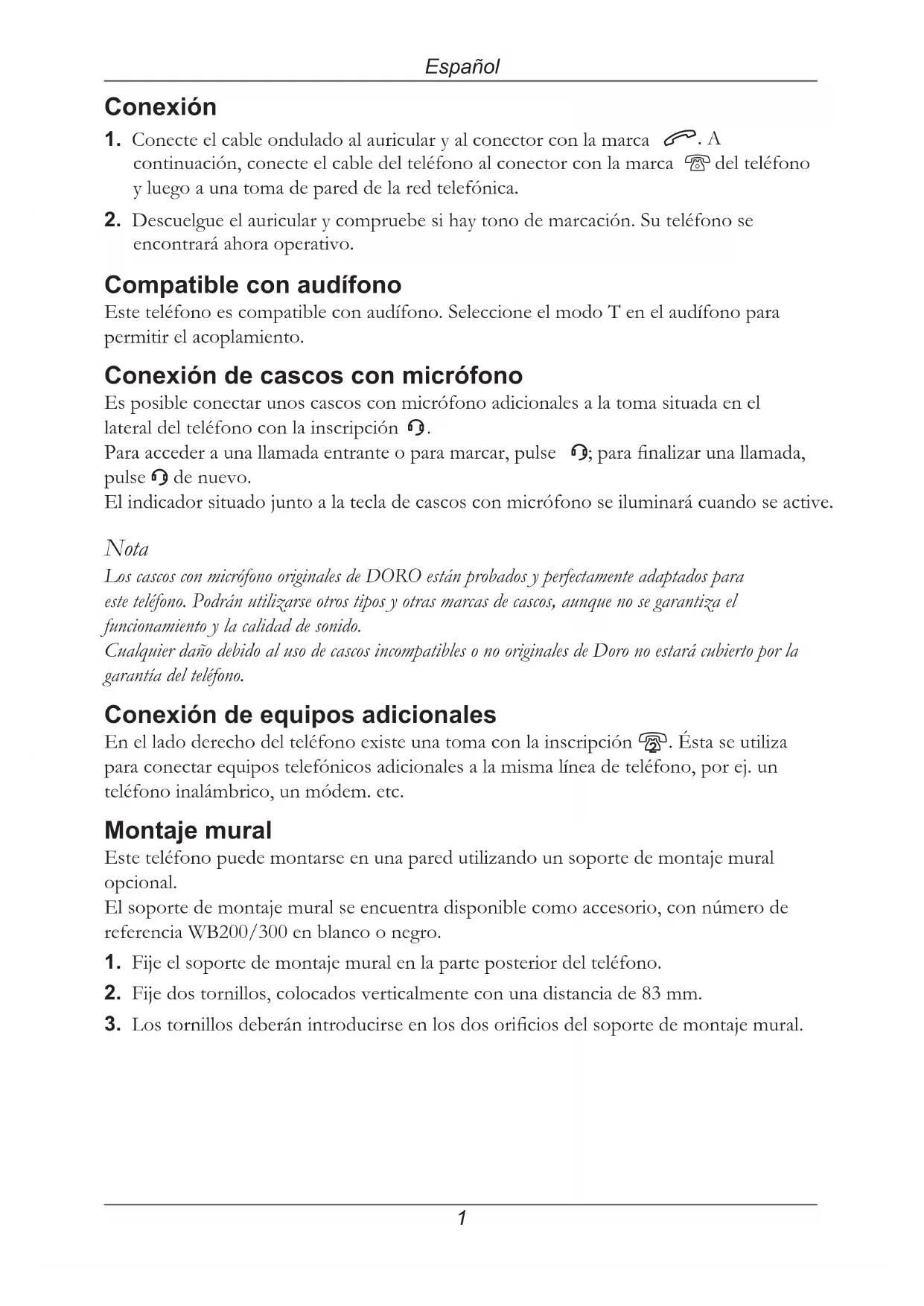de nuevo. El indicador situado junto a la tecla de cascos con micrófono se iluminará cuando se active. Nota Los cascos con micrófono originales de DORO están probados y perfectamente adaptados para este teléfono. Podrán utilizarse otros tipos y otras marcas de cascos, aunque no se garantiza el funcionamiento y la calidad de sonido. Cualquier daño debido al uso de cascos incompatibles o no originales de Doro no estará cubierto por la garantía del teléfono. Conexión de equipos adicionales En el lado derecho del teléfono existe una toma con la inscripción 8. Ésta se utiliza para conectar equipos telefónicos adicionales a la misma línea de teléfono, por ej. un teléfono inalámbrico, un módem. etc. Montaje mural Este teléfono puede montarse en una pared utilizando un soporte de montaje mural opcional. El soporte de montaje mural se encuentra disponible como accesorio, con número de referencia WB200/300 en blanco o negro.
