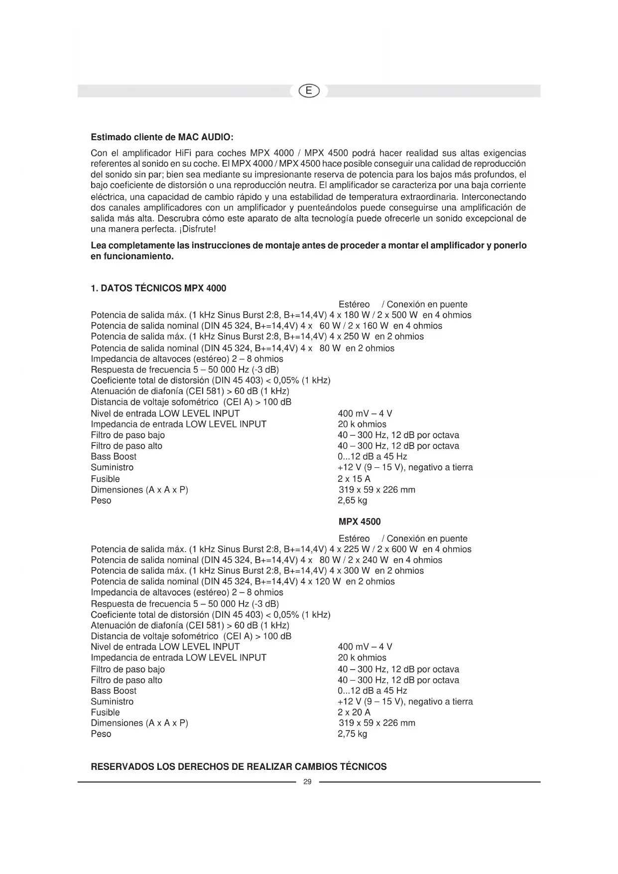 Estimado cliente de MAC AUDIO: Con el amplificador HiFi para coches MPX 4000 / MPX 4500 podrá hacer realidad sus altas exigencias referentes al sonido en su coche. El MPX 4000 / MPX 4500 hace posible conseguir una calidad de reproducción del sonido sin par; bien sea mediante su impresionante reserva de potencia para los bajos más profundos, el bajo coeficiente de distorsión o una reproducción neutra. El amplificador se caracteriza por una baja corriente eléctrica, una capacidad de cambio rápido y una estabilidad de temperatura extraordinaria. Interconectando dos canales amplificadores con un amplificador y puenteándolos puede conseguirse una amplificación de salida más alta. Descrubra cómo este aparato de alta tecnología puede ofrecerle un sonido excepcional de una manera perfecta. ¡Disfrute! Lea completamente las instrucciones de montaje antes de proceder a montar el amplificador y ponerlo en funcionamiento.