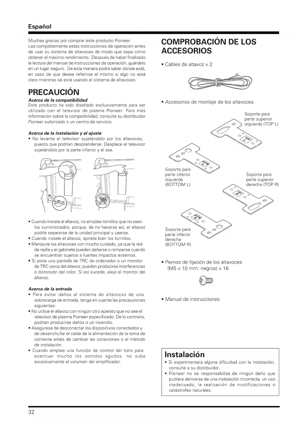 PRECAUCIÓN Acerca de la compatibilidad Este producto ha sido diseñado exclusivamente para serutilizado con el televisor de plasma Pioneer. Para másinformación sobre la compatibilidad, consulte su distribuidorPioneer autorizado o un centro de servicio. Acerca de la instalación y el ajuste • No levante el televisor sujetándolo por los altavoces,puesto que podrían desprenderse. Desplace el televisorsujetándolo por la parte inferior y el asa.