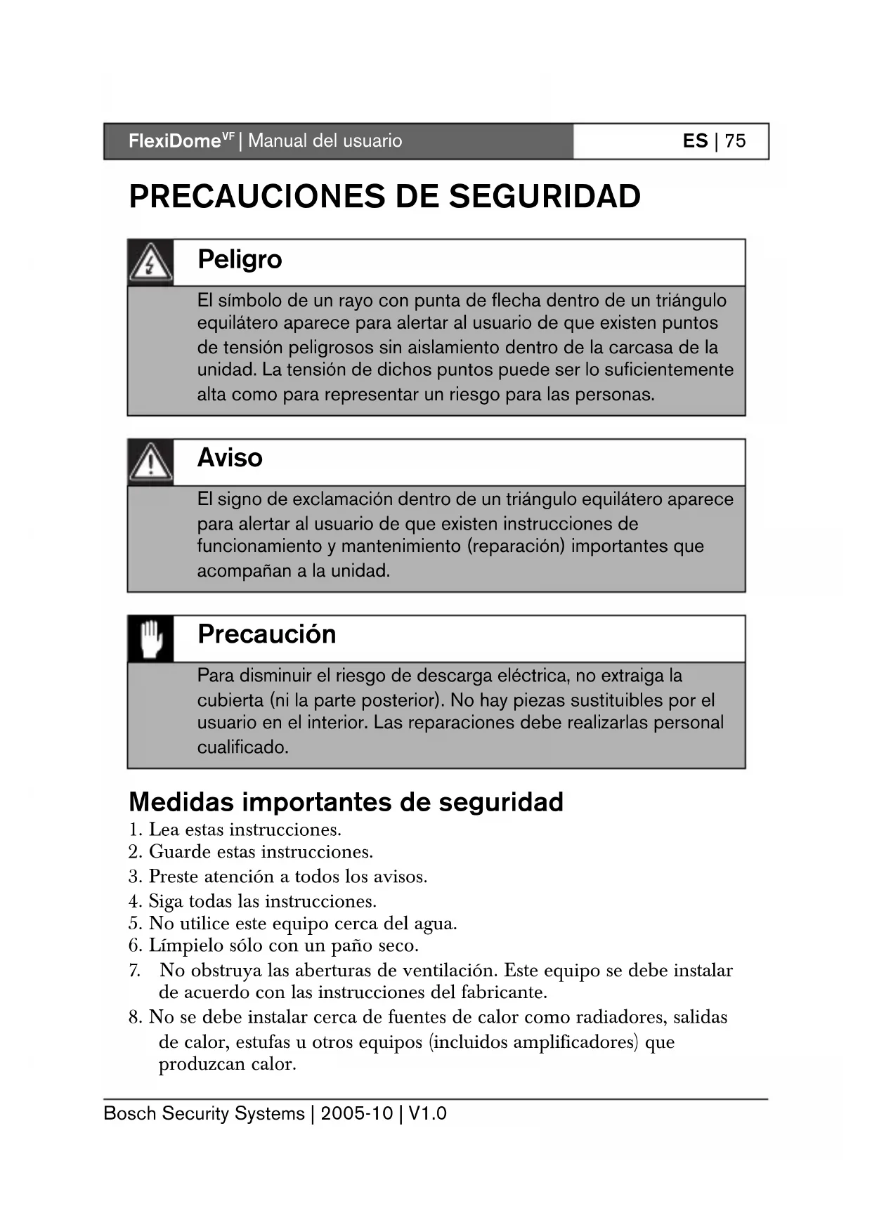 de calor, estufas u otros equipos (incluidos amplificadores) que produzcan calor. Peligro El símbolo de un rayo con punta de flecha dentro de un triángulo equilátero aparece para alertar al usuario de que existen puntos de tensión peligrosos sin aislamiento dentro de la carcasa de la unidad. La tensión de dichos puntos puede ser lo suficientemente alta como para representar un riesgo para las personas. Aviso El signo de exclamación dentro de un triángulo equilátero aparece para alertar al usuario de que existen instrucciones de funcionamiento y mantenimiento (reparación) importantes que acompañan a la unidad. Precaución Para disminuir el riesgo de descarga eléctrica, no extraiga la cubierta (ni la parte posterior). No hay piezas sustituibles por el usuario en el interior. Las reparaciones debe realizarlas personal cualificado.FlexiDome