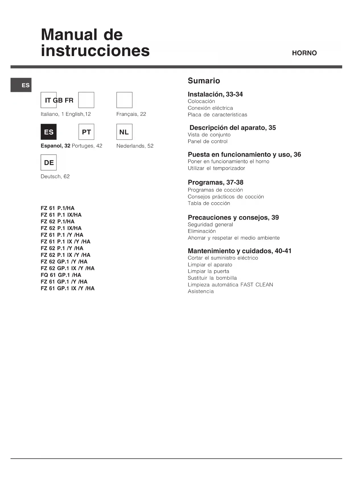 - son numéro de série (S/N) Ces informations figurent sur la plaquette signalétique apposée sur votre appareil et/ou sur son emballage.Manual de instrucciones HORNO FZ 61 P.1/HA FZ 61 P.1 IX/HA FZ 62 P.1/HA FZ 62 P.1 IX/HA FZ 61 P.1 /Y /HA FZ 61 P.1 IX /Y /HA FZ 62 P.1 /Y /HA FZ 62 P.1 IX /Y /HA FZ 62 GP.1 /Y /HA FZ 62 GP.1 IX /Y /HA FQ 61 GP.1 /HA FZ 61 GP.1 /Y /HA FZ 61 GP.1 IX /Y /HA Sumario Instalación, 33-34 Colocación Conexión eléctrica Placa de características Descripción del aparato, 35 Vista de conjunto Panel de control Puesta en funcionamiento y uso, 36 Poner en funcionamiento el horno Utilizar el temporizador Programas, 37-38 Programas de cocción Consejos prácticos de cocción Tabla de cocción Precauciones y consejos, 39 Seguridad general Eliminación Ahorrar y respetar el medio ambiente Mantenimiento y cuidados, 40-41 Cortar el suministro eléctrico Limpiar el aparato Limpiar la puerta Sustituir la bombilla Limpieza automática FAST CLEAN Asistencia