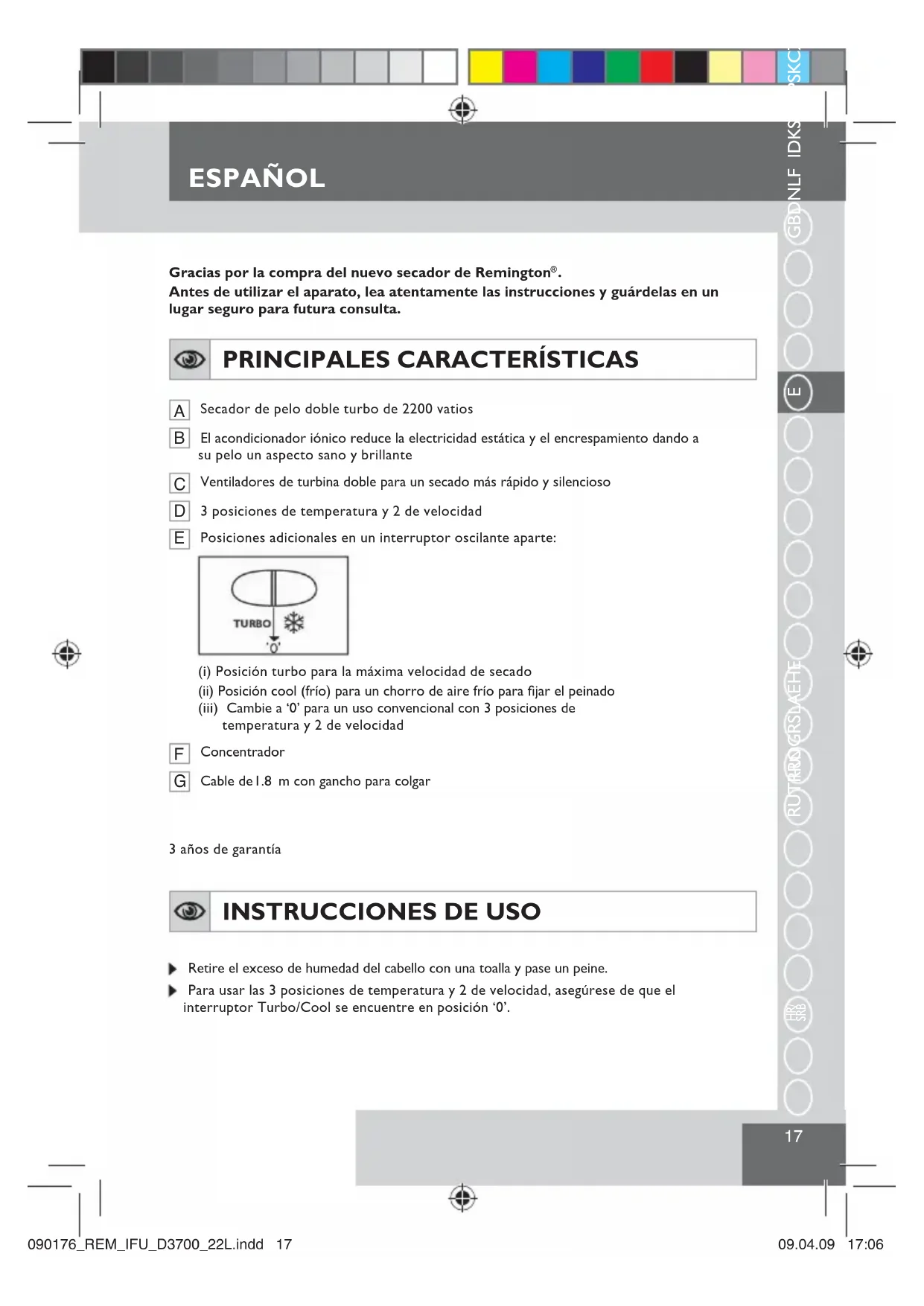 INSTRUCCIONES DE USO Retire el exceso de humedad del cabello con una toalla y pase un peine. Para usar las 3 posiciones de temperatura y 2 de velocidad, asegúrese de que el interruptor Turbo/Cool se encuentre en posición ‘0’.B5(0B,)8B'B/LQGG 1.8 3 años de garantíaESPAÑOL