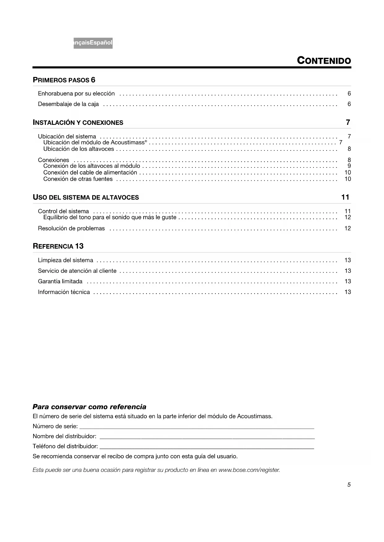 El número de serie del sistema está situado en la parte inferior del módulo de Acoustimass. Número de serie: ________________________________________________________________________________ Nombre del distribuidor: _________________________________________________________________________ Teléfono del distribuidor: _________________________________________________________________________Se recomienda conservar el recibo de compra junto con esta guía del usuario. Esta puede ser una buena ocasión para registrar su producto en línea en www.bose.com/register.6 !"#$%&'()*%)+#,-*./01&2 2 34!5EnglishFrançais Español