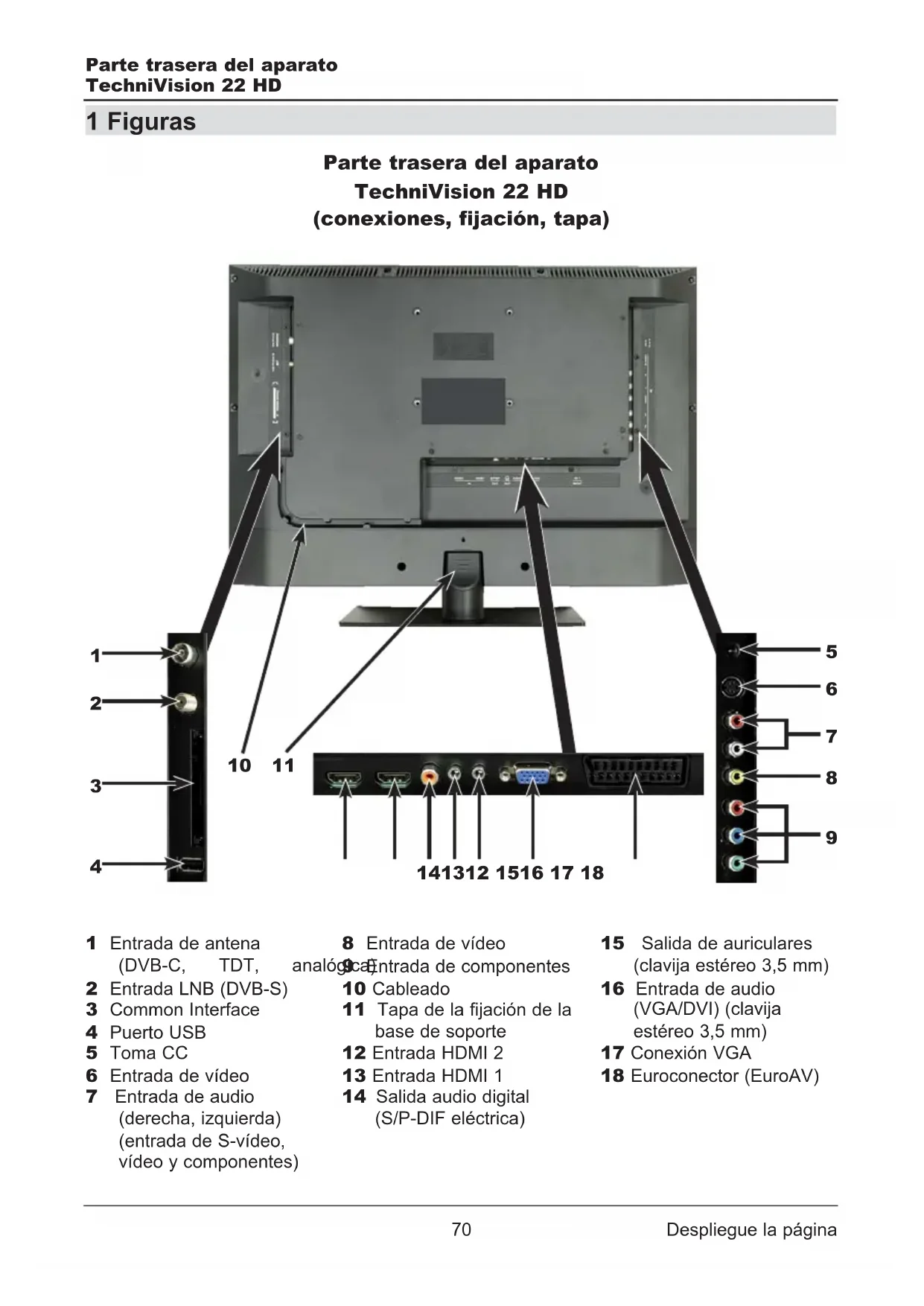 Parte trasera del aparato TechniVision 22 HD Despliegue la página 1 Entrada de antena (DVB-C, TDT, analógica) 2 Entrada LNB (DVB-S) 3 Common Interface 4 Puerto USB 5 Toma CC 6 Entrada de vídeo 7 Entrada de audio (derecha, izquierda) (entrada de S-vídeo, vídeo y componentes) 8 Entrada de vídeo 9 Entrada de componentes 10 Cableado 11 Tapa de la fijación de la base de soporte 12 Entrada HDMI 2 13 Entrada HDMI 1 14 Salida audio digital (S/P-DIF eléctrica) 15 Salida de auriculares (clavija estéreo 3,5 mm) 16 Entrada de audio (VGA/DVI) (clavija estéreo 3,5 mm) 17 Conexión VGA 18 Euroconector (EuroAV)