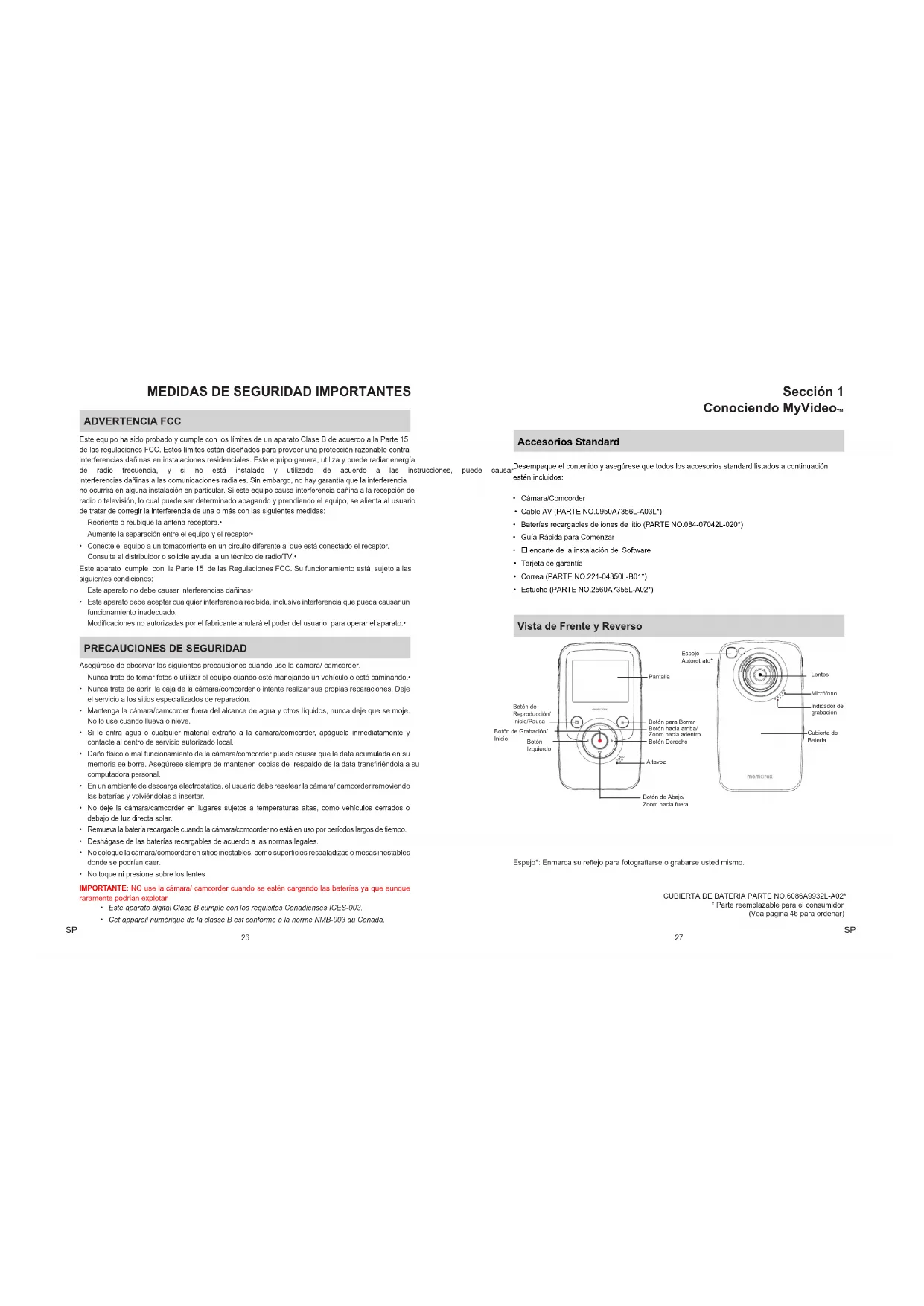 Accesorios Standard Desempaque el contenido y asegúrese que todos los accesorios standard listados a continuación estén incluidos: Cámara/Comcorder• Cable AV (PARTE NO.0950A7356L-A03L*)• Baterías recargables de iones de litio (PARTE NO.084-07042L-020*)• GuíaRápidaparaComenzar• El encarte de la instalación del Software• Tarjeta de garantía• Correa (PARTE NO.221-04350L-B01*)• Estuche (PARTE NO.2560A7355L-A02*)• Vista de Frente y Reverso Espejo*:Enmarcasureejoparafotograarseograbarseustedmismo. Botón IzquierdoBotón de Reproducción/Inicio/PausaBotón DerechoPantallaBotón para BorrarBotón hacia arriba/ Zoom hacia adentroAltavozBotón de Abajo/ Zoom hacia fueraBotón de Grabación/InicioEspejo Autoretrato*MicrófonoLentesIndicador de grabaciónCubierta de Bateria CUBIERTA DE BATERIA PARTE NO.6086A9932L-A02* *Partereemplazableparaelconsumidor (Vea página 46 para ordenar)28