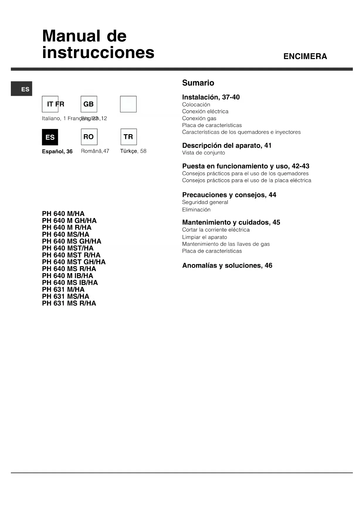 - son numéro de série (S/N) Ces informations figurent sur la plaquette signalétique apposée sur votre appareil et/ou sur son emballage. ! Ne faites jamais appel à des techniciens non agréés et refusez toujours l’installation de pièces détachées non originales.ES ENCIMERA Sumario Instalación, 37-40 Colocación Conexión eléctrica Conexión gas Placa de características Características de los quemadores e inyectores Descripción del aparato, 41 Vista de conjunto Puesta en funcionamiento y uso, 42-43 Consejos prácticos para el uso de los quemadores Consejos prácticos para el uso de la placa eléctrica Precauciones y consejos, 44 Seguridad general Eliminación Mantenimiento y cuidados, 45 Cortar la corriente eléctrica Limpiar el aparato Mantenimiento de las llaves de gas Placa de características Anomalías y soluciones, 46 Manual de instrucciones Español, 36