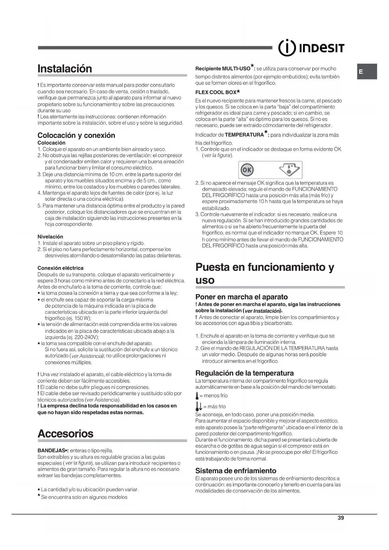La empresa declina toda responsabilidad en los casos enque no hayan sido respetadas estas normas. Accesorios BANDEJAS•: enteras o tipo rejilla.Son extraíbles y su altura es regulable gracias a las guíasespeciales (ver la figura), se utilizan para introducir recipientes oalimentos de gran tamaño. Para regular la altura no es necesarioextraer las bandejas completamentes. Recipiente MULTI-USO*: se utiliza para conservar por mucho tiempo distintos alimentos (por ejemplo embutidos); evita tambiénque se formen olores en el frigorífico.FLEX COOL BOX * Es el nuevo recipiente para mantener frescos la carne, el pescadoy los quesos. Si se coloca en la parta “baja” del compartimientorefrigerador es ideal para carne y pescado; si en cambio, secoloca en la parte “alta” es óptimo para los quesos. Si no esnecesario, puede ser extraido cómodamente del refrigerador.Indicador de TEMPERATURA *: para individualizar la zona más fría del frigorífico.1. Controle que en el indicador se destaque en forma evidente OK ( ver la figura ). 2. Si no aparece el mensaje OK significa que la temperatura esdemasiado elevada: regule el mando de FUNCIONAMIENTODEL FRIGORÍFICO hasta una posición más alta (más frío) yespere proximadamente 10 h hasta que la temperatura se hayaestabilizado.3. Controle nuevamente el indicador: si es necesario, realice unanueva regulación. Si se han introducido grandes cantidades dealimentos o si se ha abierto frecuentemente la puerta delfrigorífico, es normal que el indicador no marque OK. Espere 10h como mínimo antes de llevar el mando de FUNCIONAMIENTODEL FRIGORÍFICO hasta una posición más alta. Puesta en funcionamiento y