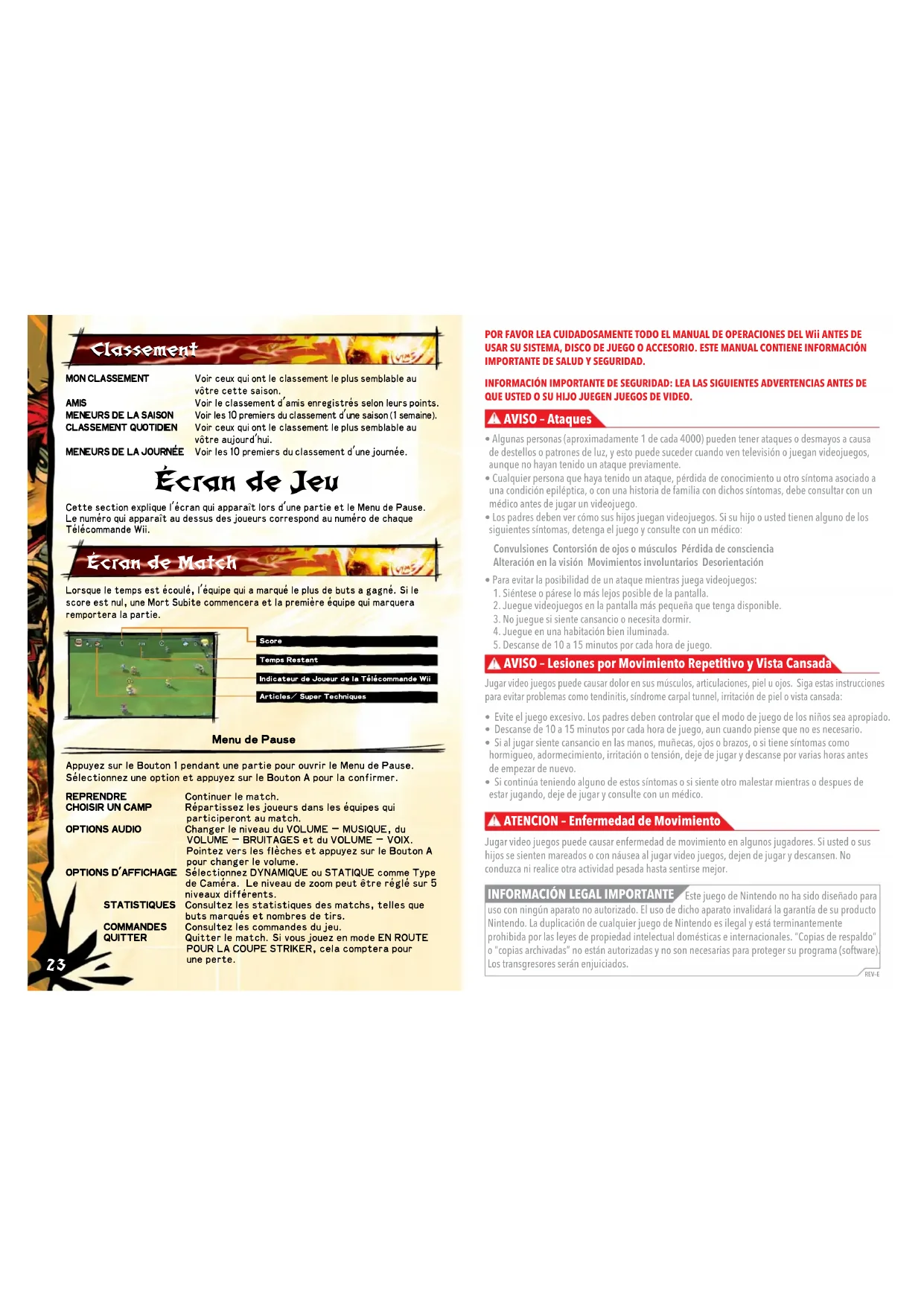 Liste d’Amis Code d’Ami du JoueurPOR FAVOR LEA CUIDADOSAMENTE TODO EL MANUAL DE OPERACIONES DEL Wii ANTES DE USAR SU SISTEMA, DISCO DE JUEGO O ACCESORIO. ESTE MANUAL CONTIENE INFORMACIÓN IMPORTANTE DE SALUD Y SEGURIDAD.INFORMACIÓN IMPORTANTE DE SEGURIDAD: LEA LAS SIGUIENTES ADVERTENCIAS ANTES DE QUE USTED O SU HIJO JUEGEN JUEGOS DE VIDEO.• Algunas personas (aproximadamente 1 de cada 4000) pueden tener ataques o desmayos a causa de destellos o patrones de luz, y esto puede suceder cuando ven televisión o juegan videojuegos, aunque no hayan tenido un ataque previamente.• Cualquier persona que haya tenido un ataque, pérdida de conocimiento u otro síntoma asociado a una condición epiléptica, o con una historia de familia con dichos síntomas, debe consultar con un médico antes de jugar un videojuego.• Los padres deben ver cómo sus hijos juegan videojuegos. Si su hijo o usted tienen alguno de los siguientes síntomas, detenga el juego y consulte con un médico: Convulsiones Contorsión de ojos o músculos Pérdida de consciencia Alteración en la visión Movimientos involuntarios Desorientación• Para evitar la posibilidad de un ataque mientras juega videojuegos: 1. Siéntese o párese lo más lejos posible de la pantalla. 2. Juegue videojuegos en la pantalla más pequeña que tenga disponible. 3. No juegue si siente cansancio o necesita dormir. 4. Juegue en una habitación bien iluminada. 5. Descanse de 10 a 15 minutos por cada hora de juego.REV–EAVISO – AtaquesJugar video juegos puede causar dolor en sus músculos, articulaciones, piel u ojos. Siga estas instrucciones para evitar problemas como tendinitis, síndrome carpal tunnel, irritación de piel o vista cansada:• Evite el juego excesivo. Los padres deben controlar que el modo de juego de los niños sea apropiado. • Descanse de 10 a 15 minutos por cada hora de juego, aun cuando piense que no es necesario.• Si al jugar siente cansancio en las manos, muñecas, ojos o brazos, o si tiene síntomas como hormigueo, adormecimiento, irritación o tensión, deje de jugar y descanse por varias horas antes de empezar de nuevo. • Si continúa teniendo alguno de estos síntomas o si siente otro malestar mientras o despues de estar jugando, deje de jugar y consulte con un médico.Jugar video juegos puede causar enfermedad de movimiento en algunos jugadores. Si usted o sus hijos se sienten mareados o con náusea al jugar video juegos, dejen de jugar y descansen. No conduzca ni realice otra actividad pesada hasta sentirse mejor.INFORMACIÓN LEGAL IMPORTANTEATENCION – Enfermedad de MovimientoAVISO – Lesiones por Movimiento Repetitivo y Vista Cansada Este juego de Nintendo no ha sido diseñado para uso con ningún aparato no autorizado. El uso de dicho aparato invalidará la garantía de su producto Nintendo. La duplicación de cualquier juego de Nintendo es ilegal y está terminantemente prohibida por las leyes de propiedad intelectual domésticas e internacionales. “Copias de respaldo” o “copias archivadas” no están autorizadas y no son necesarias para proteger su programa (software). Los transgresores serán enjuiciados. 23