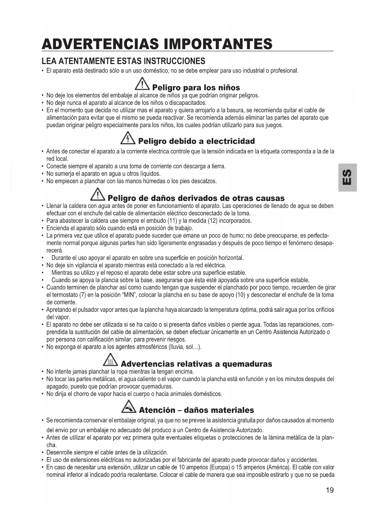 • Antes de conectar el aparato a la corriente electrica controle que la tensión indicada en la etiqueta corresponda a la de la red local.• Conecte siempre el aparato a una toma de corriente con descarga a tierra.• No sumerja el aparato en agua u otros líquidos.• No empiecen a planchar con las manos húmedas o los pies descalzos. Peligro de daños derivados de otras causas • Llenar la caldera con agua antes de poner en funcionamiento el aparato. Las operaciones de llenado de agua se deben efectuar con el enchufe del cable de alimentación eléctrico desconectado de la toma.• Para abastecer la caldera use siempre el embudo (11) y la medida (12) incorporados.• Encienda el aparato sólo cuando está en posición de trabajo. • La primera vez que utilice el aparato puede suceder que emane un poco de humo; no debe preocuparse, es perfecta-mente normal porque algunas partes han sido ligeramente engrasadas y después de poco tiempo el fenómeno desapa-recerá. • Duranteelusoapoyarelaparatoensobreunasupercieenposiciònhorizontal.• No deje sin vigilancia el aparato mientras está conectado a la red eléctrica.• Mientrassuutilizoyelreposoelaparatodebeestarsobreunasupercieestable.• Cuandoseapoyalaplanciasobrelabase,asegurarsequeèstaestèapoyadasobreunasupercieestable.• Cuando terminen de planchar así como cuando tengan que suspender el planchado por poco tiempo, recuerden de girar el termostato (7) en la posición “MIN”, colocar la plancha en su base de apoyo (10) y desconectar el enchufe de la toma de corriente. • Apretandoelpulsadorvaporantesquelaplanchahayaalcanzadolatemperaturaóptima,podrásaliraguaporlosoricios del vapor. • El aparato no debe ser utilizada si se ha caído o si presenta daños visibles o pierde agua. Todas las reparaciones, com- prendida la sustitución del cable de alimentación, se deben efectuar únicamente en un Centro Asistencia Autorizado o porpersonaconcalicaciónsimilar,paraprevenirriesgos.• No exponga el aparato a los agentes atmosféricos (lluvia, sol…). Advertencias relativas a quemaduras • No intente jamas planchar la ropa mientras la tengan encima. • No tocar las partes metálicas, el agua caliente o el vapor cuando la plancha está en función y en los minutos después del apagado, puesto que podrían provocar quemaduras.• No dirija el chorro de vapor hacia el cuerpo o hacia animales domésticos. Atención – daños materiales