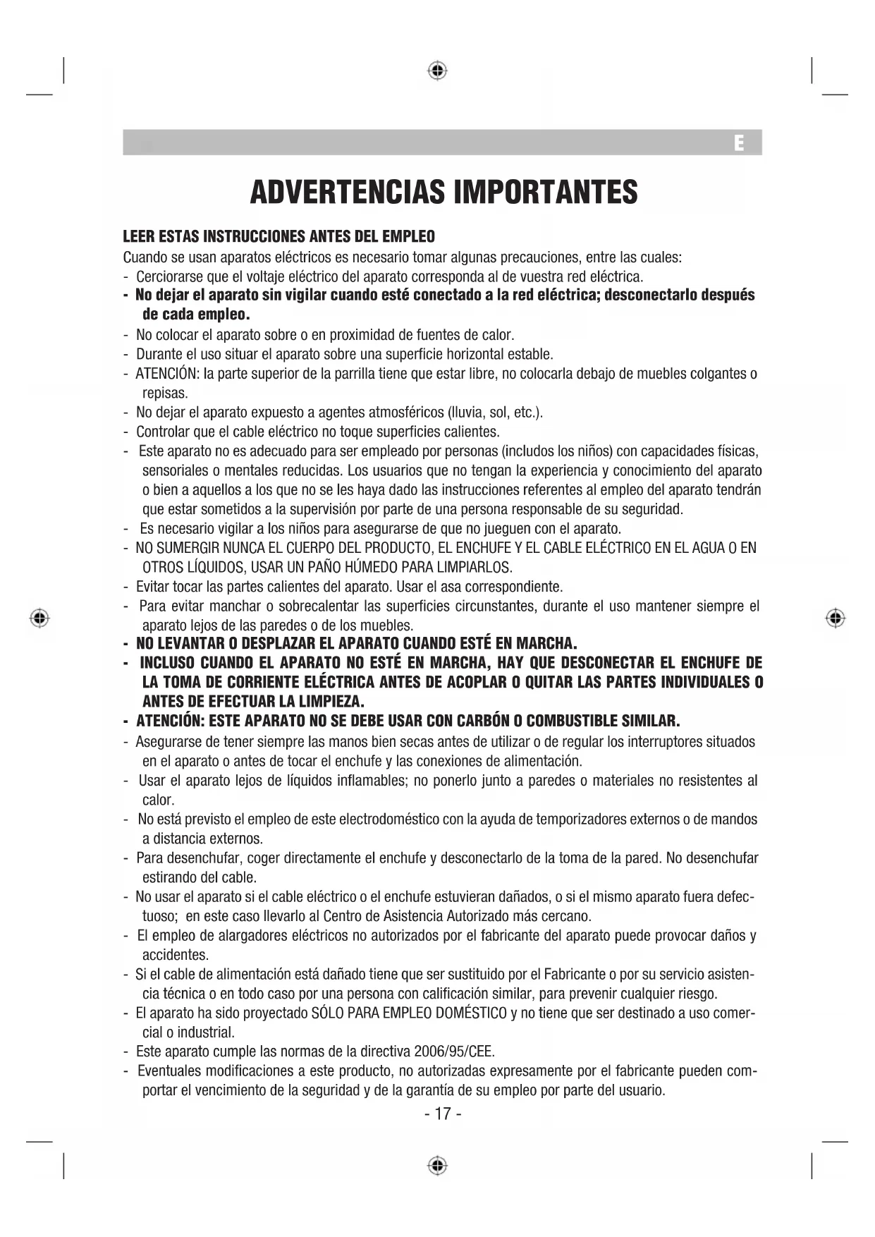 - 16 -ADVERTENCIAS IMPORTANTES LEER ESTAS INSTRUCCIONES ANTES DEL EMPLEO Cuando se usan aparatos eléctricos es necesario tomar algunas precauciones, entre las cuales: