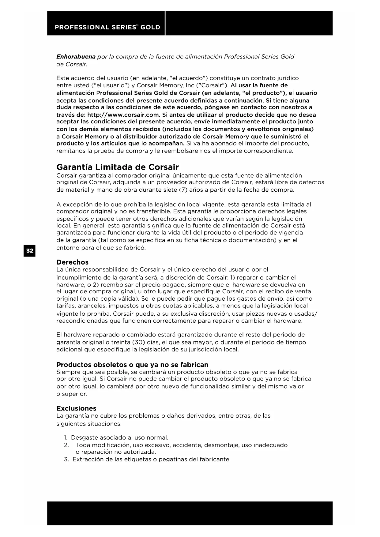 GOLD Enhorabuena por la compra de la fuente de alimentación Professional Series Gold de Corsair. Este acuerdo del usuario (en adelante, "el acuerdo") constituye un contrato jurídico entre usted ("el usuario") y Corsair Memory, Inc ("Corsair"). Al usar la fuente de alimentación Professional Series Gold de Corsair (en adelante, “el producto”), el usuario acepta las condiciones del presente acuerdo definidas a continuación. Si tiene alguna duda respecto a las condiciones de este acuerdo, póngase en contacto con nosotros a través de: http://www.corsair.com. Si antes de utilizar el producto decide que no desea aceptar las condiciones del presente acuerdo, envíe inmediatamente el producto junto con los demás elementos recibidos (incluidos los documentos y envoltorios originales) a Corsair Memory o al distribuidor autorizado de Corsair Memory que le suministró el producto y los artículos que lo acompañan. Si ya ha abonado el importe del producto, remítanos la prueba de compra y le reembolsaremos el importe correspondiente. Garantía Limitada de Corsair Corsair garantiza al comprador original únicamente que esta fuente de alimentación original de Corsair, adquirida a un proveedor autorizado de Corsair, estará libre de defectos de material y mano de obra durante siete (7) años a partir de la fecha de compra. A excepción de lo que prohíba la legislación local vigente, esta garantía está limitada al comprador original y no es transferible. Esta garantía le proporciona derechos legales especícos y puede tener otros derechos adicionales que varían según la legislación local. En general, esta garantía signica que la fuente de alimentación de Corsair está garantizada para funcionar durante la vida útil del producto o el periodo de vigencia de la garantía (tal como se especica en su cha técnica o documentación) y en el entorno para el que se fabricó. Derechos La única responsabilidad de Corsair y el único derecho del usuario por el incumplimiento de la garantía será, a discreción de Corsair: 1) reparar o cambiar el hardware, o 2) reembolsar el precio pagado, siempre que el hardware se devuelva en el lugar de compra original, u otro lugar que especifique Corsair, con el recibo de venta original (o una copia válida). Se le puede pedir que pague los gastos de envío, así como tarifas, aranceles, impuestos u otras cuotas aplicables, a menos que la legislación local vigente lo prohíba. Corsair puede, a su exclusiva discreción, usar piezas nuevas o usadas/ reacondicionadas que funcionen correctamente para reparar o cambiar el hardware. El hardware reparado o cambiado estará garantizado durante el resto del periodo de garantía original o treinta (30) días, el que sea mayor, o durante el periodo de tiempo adicional que especifique la legislación de su jurisdicción local. Productos obsoletos o que ya no se fabrican Siempre que sea posible, se cambiará un producto obsoleto o que ya no se fabrica por otro igual. Si Corsair no puede cambiar el producto obsoleto o que ya no se fabrica por otro igual, lo cambiará por otro nuevo de funcionalidad similar y del mismo valor o superior. Exclusiones La garantía no cubre los problemas o daños derivados, entre otras, de las siguientes situaciones: