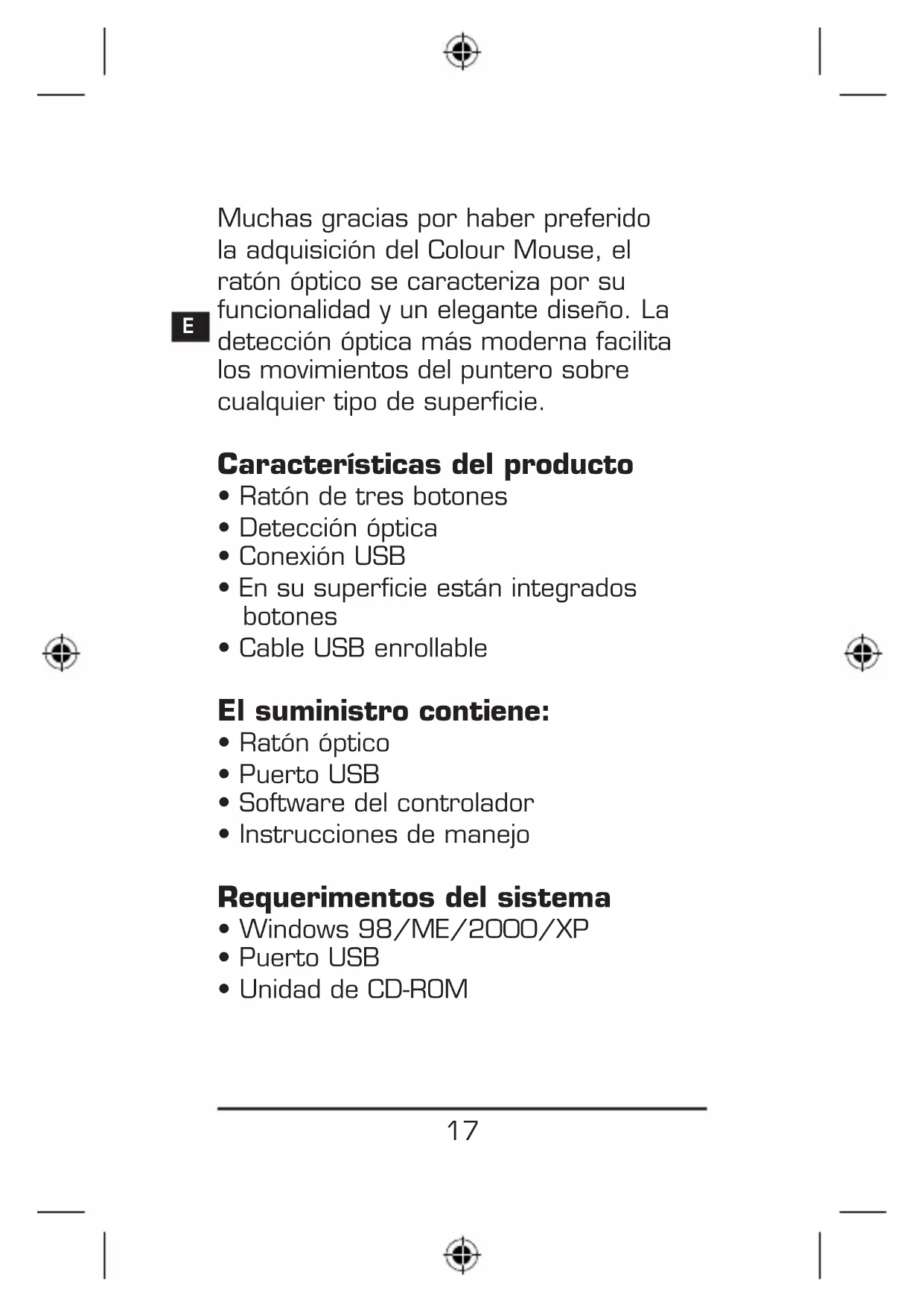 Muchas gracias por haber preferido la adquisición del Colour Mouse, el ratón óptico se caracteriza por su funcionalidad y un elegante diseño. La detección óptica más moderna facilita los movimientos del puntero sobre cualquier tipo de superficie. Características del producto