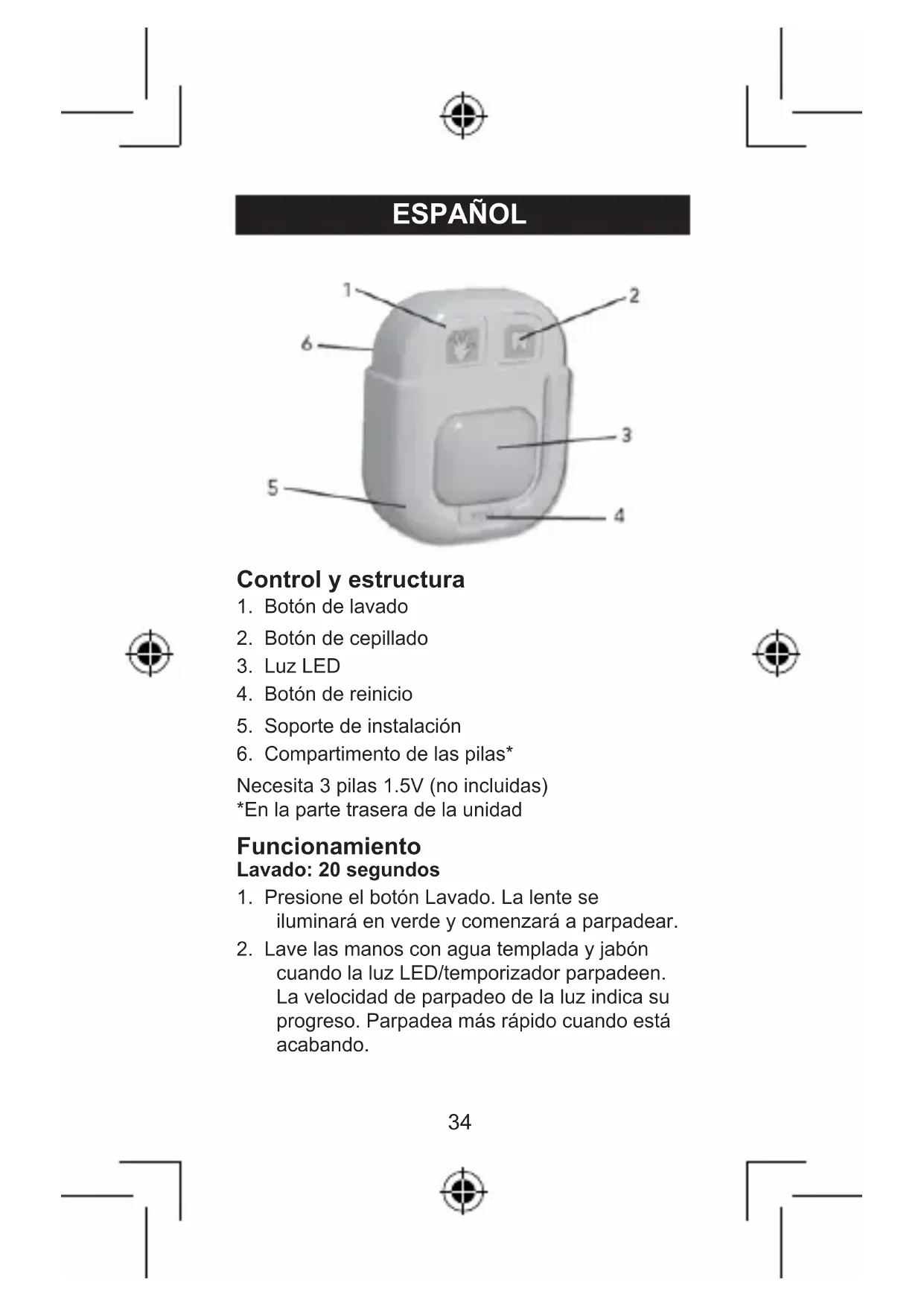 Necesita 3 pilas 1.5V (no incluidas) *En la parte trasera de la unidad Funcionamiento Lavado: 20 segundos