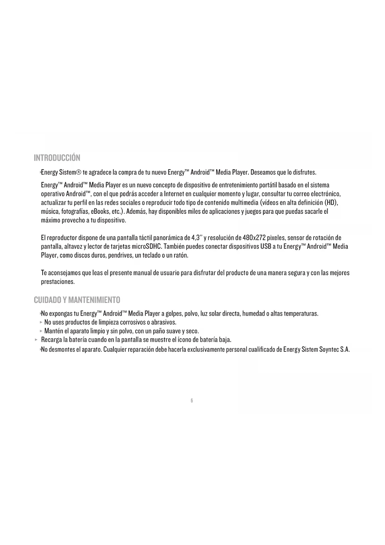 Energy Sistem® te agradece la compra de tu nuevo Energy™ Android™ Media Player. Deseamos que lo disfrutes. Energy™ Android™ Media Player es un nuevo concepto de dispositivo de entretenimiento portátil basado en el sistema operativo Android™, con el que podrás acceder a Internet en cualquier momento y lugar, consultar tu correo electrónico, actualizar tu perfil en las redes sociales o reproducir todo tipo de contenido multimedia (vídeos en alta definición (HD), música, fotografías, eBooks, etc.). Además, hay disponibles miles de aplicaciones y juegos para que puedas sacarle el máximo provecho a tu dispositivo. El reproductor dispone de una pantalla táctil panorámica de 4,3’’ y resolución de 480x272 pixeles, sensor de rotación de pantalla, altavoz y lector de tarjetas microSDHC. También puedes conectar dispositivos USB a tu Energy™ Android™ Media Player, como discos duros, pendrives, un teclado o un ratón. Te aconsejamos que leas el presente manual de usuario para disfrutar del producto de una manera segura y con las mejores prestaciones.
