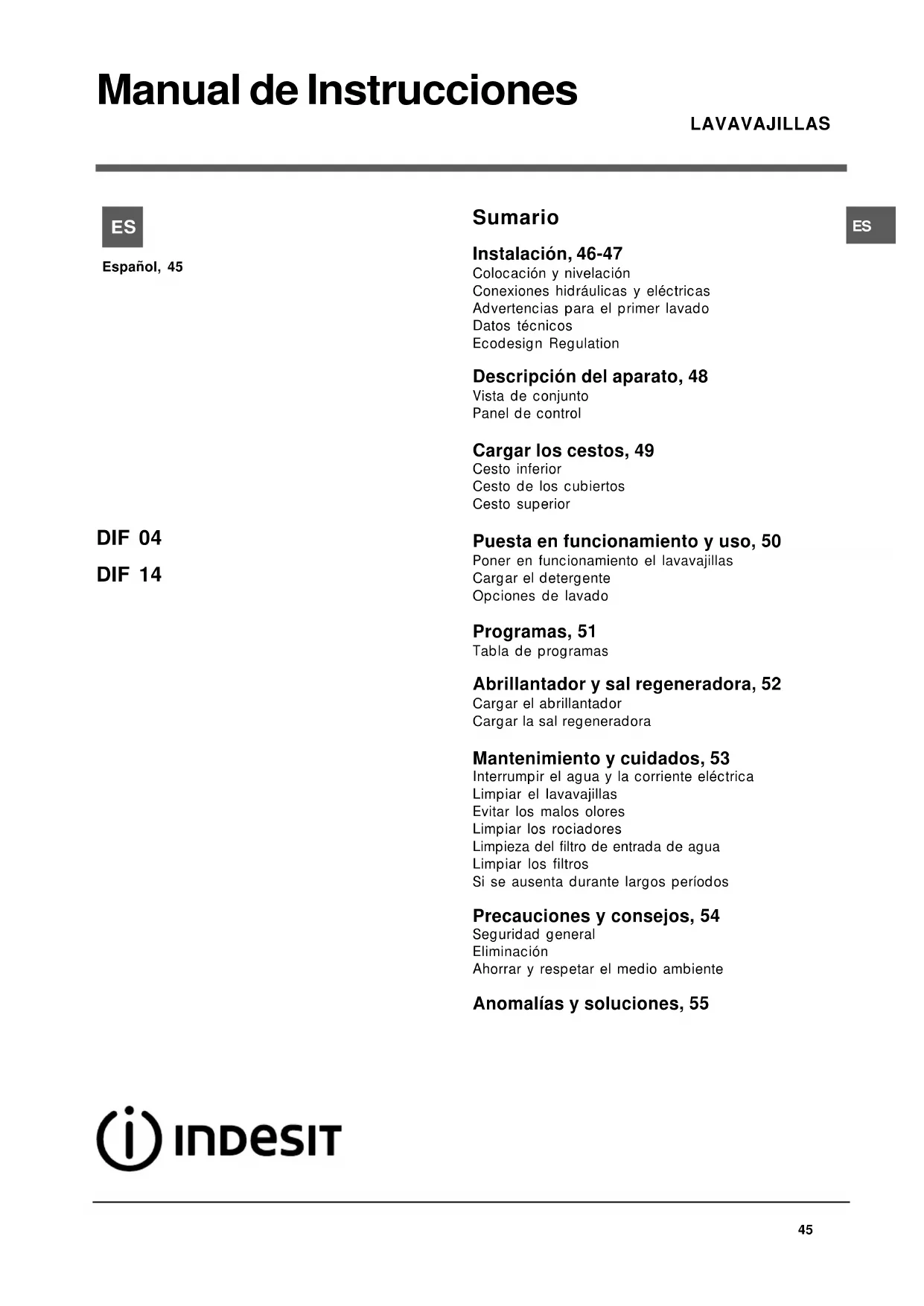 DIF 14 A .R - Lavavajillas INDESIT - Manual de uso y guía de instrucciones gratis