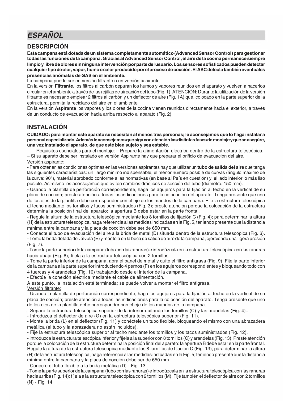 Sostituire con lampade dello stesso tipo. ATTENZIONE: non toccare la lampadina a mani nude.ESPAÑOL DESCRIPCIÓN Esta campana está dotada de un sistema completamente automático (Advanced Sensor Control) para gestionar