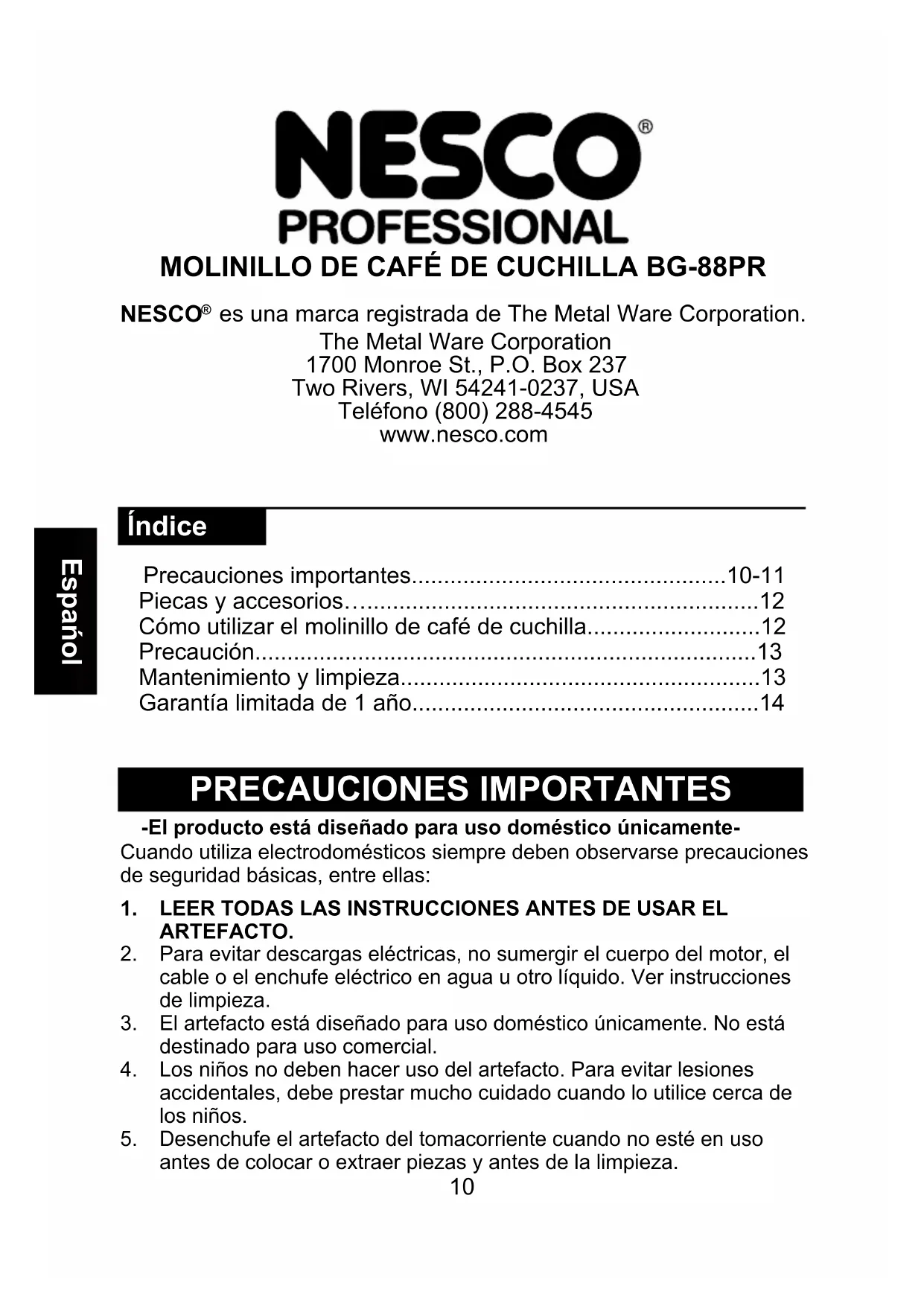 Espańol No ponga en funcionamiento el artefacto si el cable o el enchufe están dañados, o luego de fallas o daños de otra naturaleza. Devuelva el artefacto al Departamento de Servicio de Fábrica de NESCO® para su revisión, reparación o ajuste. No utilice agua para limpiar el molinillo, utilice un cepillo para retirar las obstrucciones sólo si el molinillo no funciona correctamente. El empleo de accesorios no recomendados por el fabricante del artefacto puede causar lesiones. No lo utilice en exteriores. No permita que el cable quede colgando en el borde de la mesa o que esté en contacto con supercies calientes. No utilice el artefacto para otros usos. No lo coloque sobre o cerca de una hornalla eléctrica o a gas caliente o dentro de un horno caliente. Evite el contacto con las piezas móviles. Asegúrese de que el artefacto esté apagado (OFF), el motor se haya detenido por completo y que el artefacto esté desenchufado antes de colocar o extraer los accesorios y antes de limpiarlo.