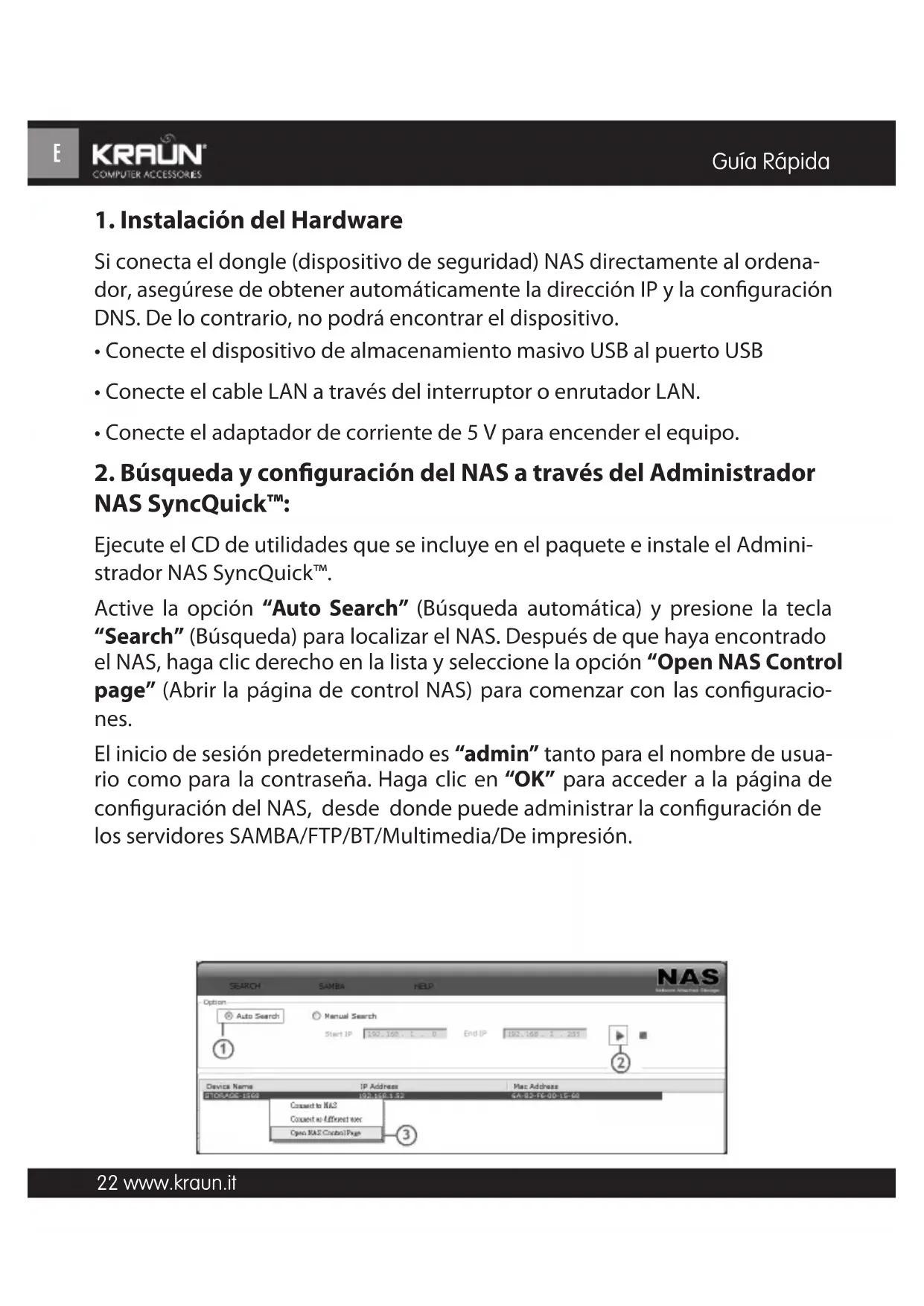 NAS SyncQuick™: Ejecute el CD de utilidades que se incluye en el paquete e instale el Admini- strador NAS SyncQuick™. Active la opción “Auto Search” (Búsqueda automática) y presione la tecla “Search” (Búsqueda) para localizar el NAS. Después de que haya encontrado el NAS, haga clic derecho en la lista y seleccione la opción “Open NAS Control page” (Abrir la página de control NAS) para comenzar con las conguracio- nes. El inicio de sesión predeterminado es “admin” tanto para el nombre de usua- rio como para la contraseña. Haga clic en “OK” para acceder a la página de conguración del NAS, desde donde puede administrar la conguración de los servidores SAMBA/FTP/BT/Multimedia/De impresión.Guía Rápida 23www.kraun.it