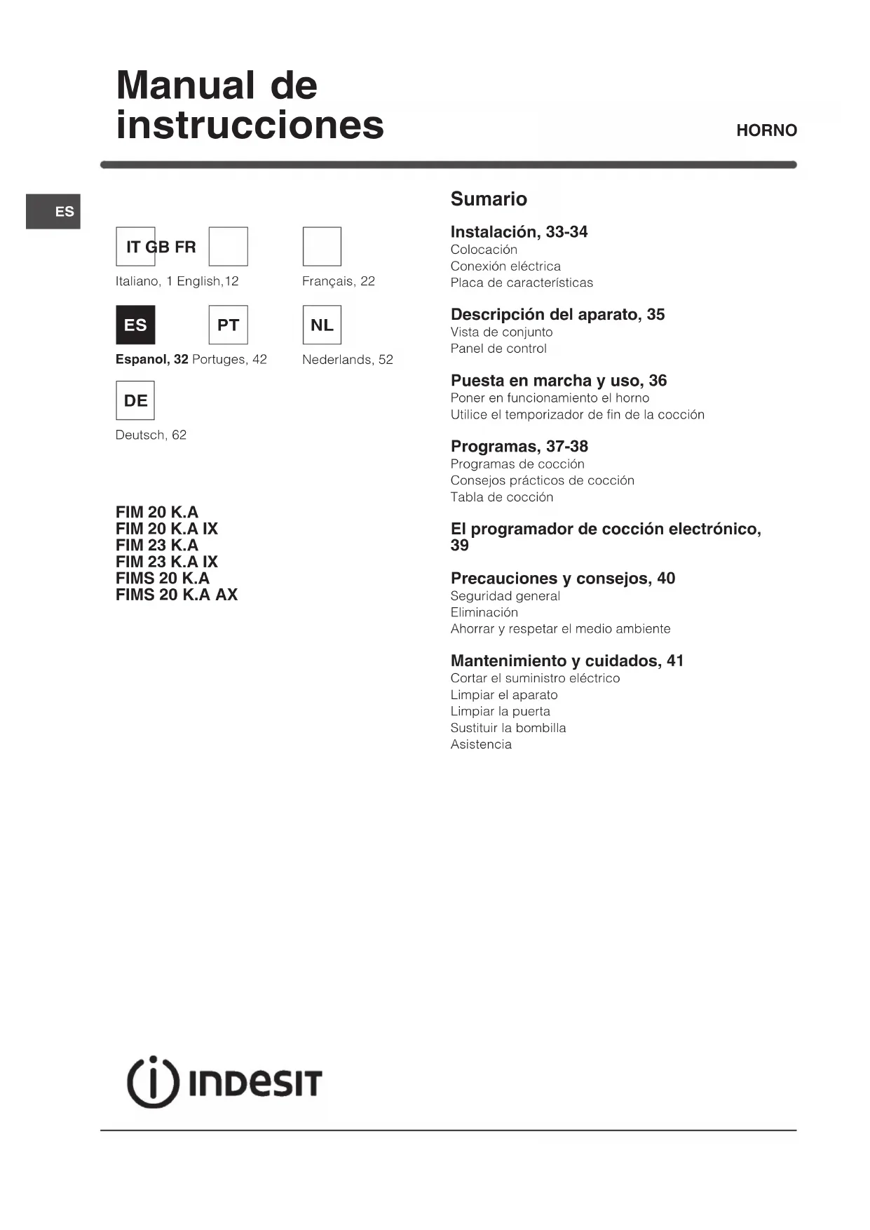 Encuentra gratis el manual del aparato FIM 20 KA IX INDESIT en formato PDF.