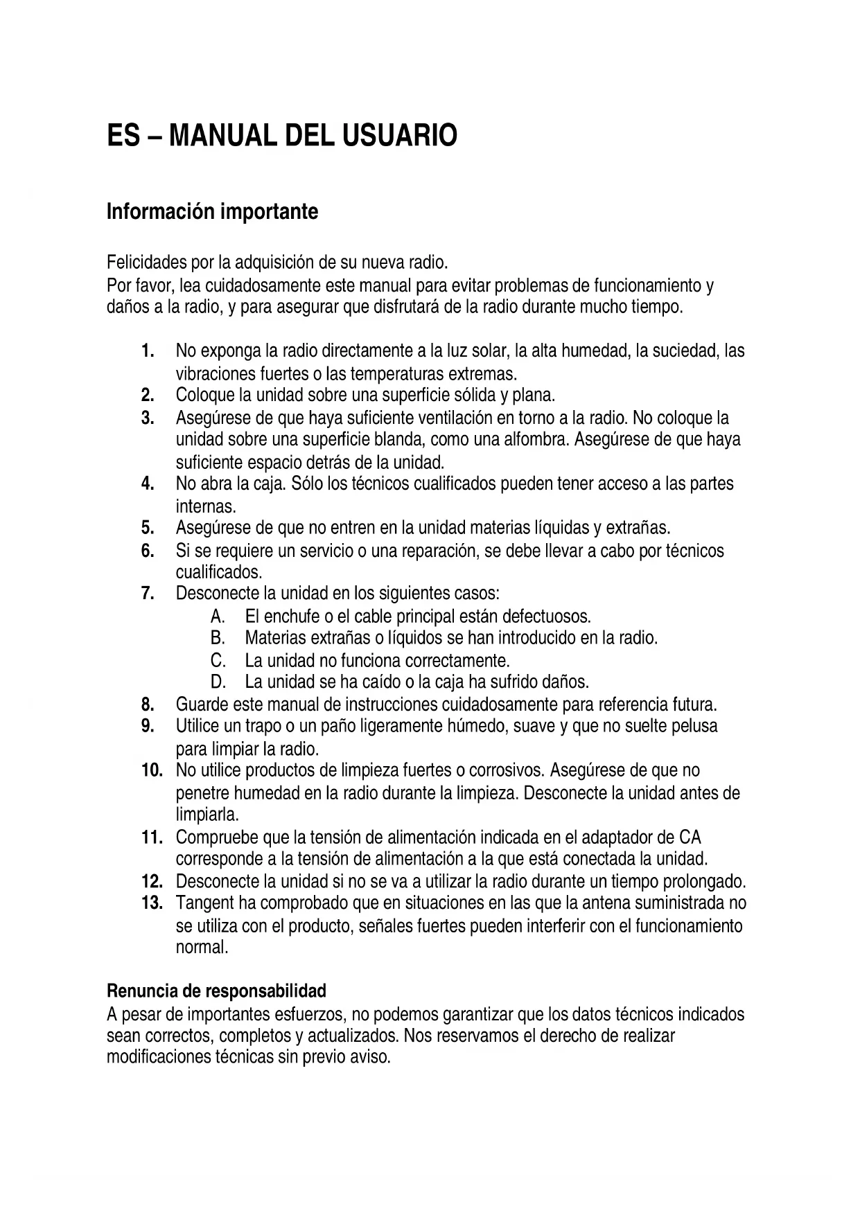 Descarga las instrucciones para tu Radio en formato PDF gratis! Encuentra tus instrucciones Alio FMCD - TANGENT y toma tu dispositivo electrónico nuevamente en la mano. En esta página están publicados todos los documentos necesarios para el uso de su dispositivo. Alio FMCD de la marca TANGENT.