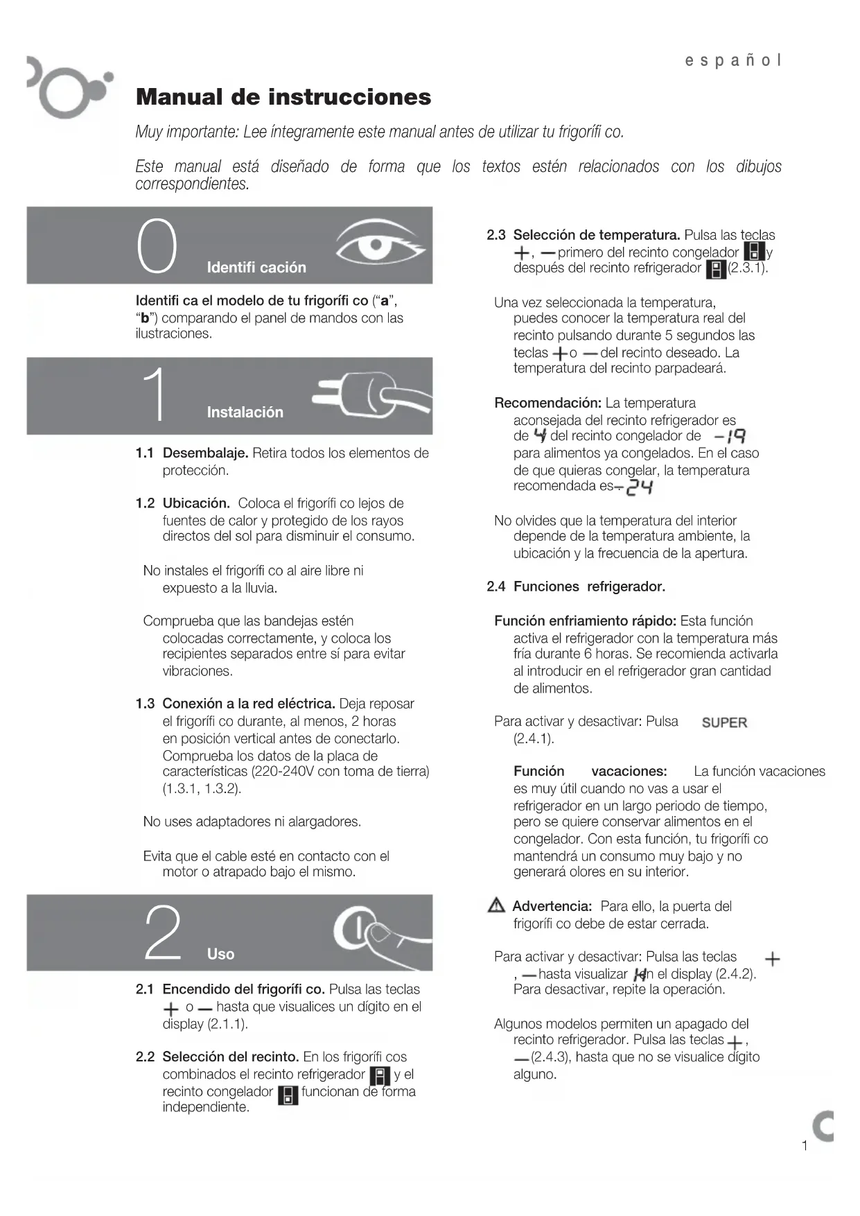 2.1 Encendido del frigorífi co. Pulsa las teclas