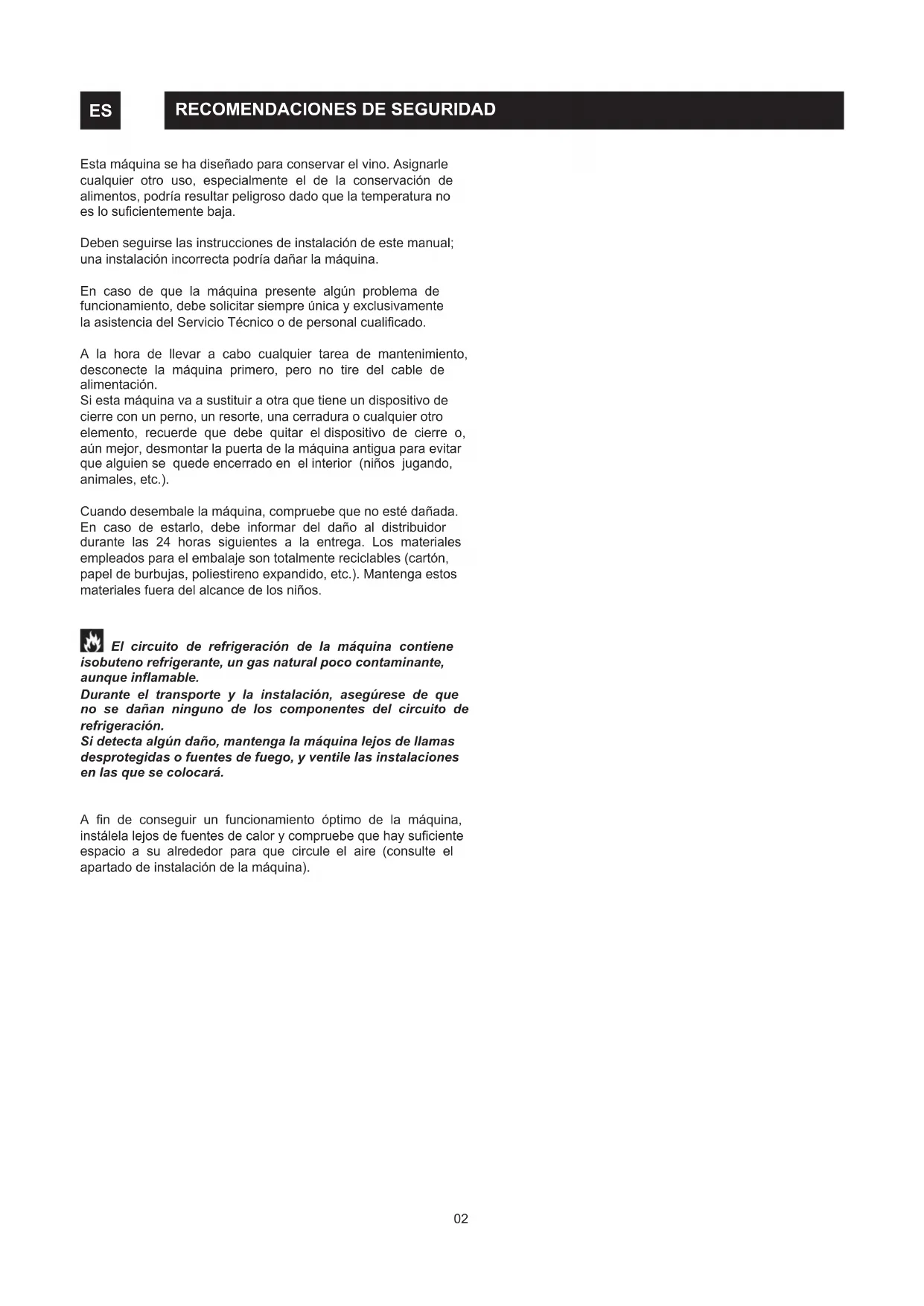 RECOMENDACIONES DE SEGURIDAD ES Esta máquina se ha diseñado para conservar el vino. Asignarle
