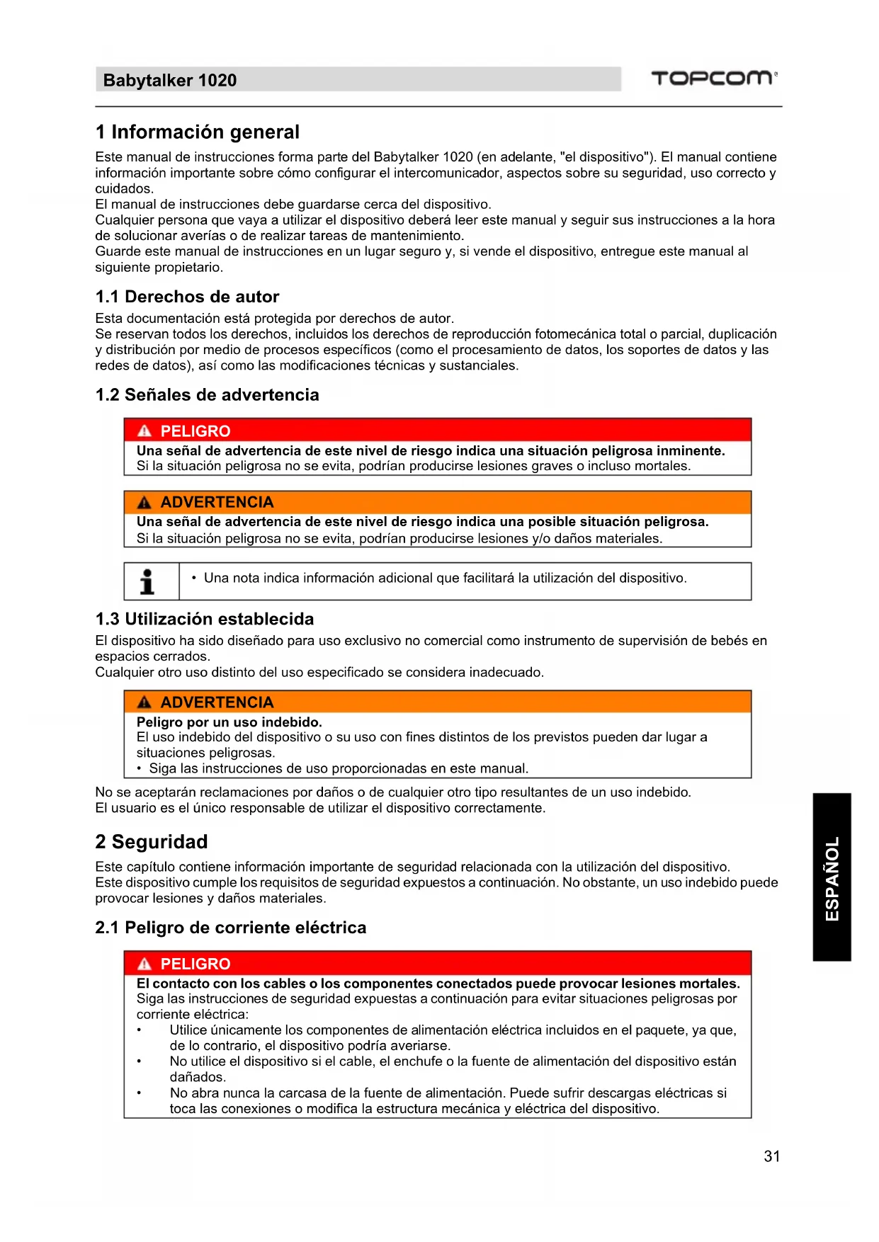 ESPAÑOL 1 Información general Este manual de instrucciones forma parte del Babytalker 1020 (en adelante, "el dispositivo"). El manual contiene información importante sobre cómo configurar el intercomunicador, aspectos sobre su seguridad, uso correcto y cuidados. El manual de instrucciones debe guardarse cerca del dispositivo. Cualquier persona que vaya a utilizar el dispositivo deberá leer este manual y seguir sus instrucciones a la hora de solucionar averías o de realizar tareas de mantenimiento. Guarde este manual de instrucciones en un lugar seguro y, si vende el dispositivo, entregue este manual al siguiente propietario.