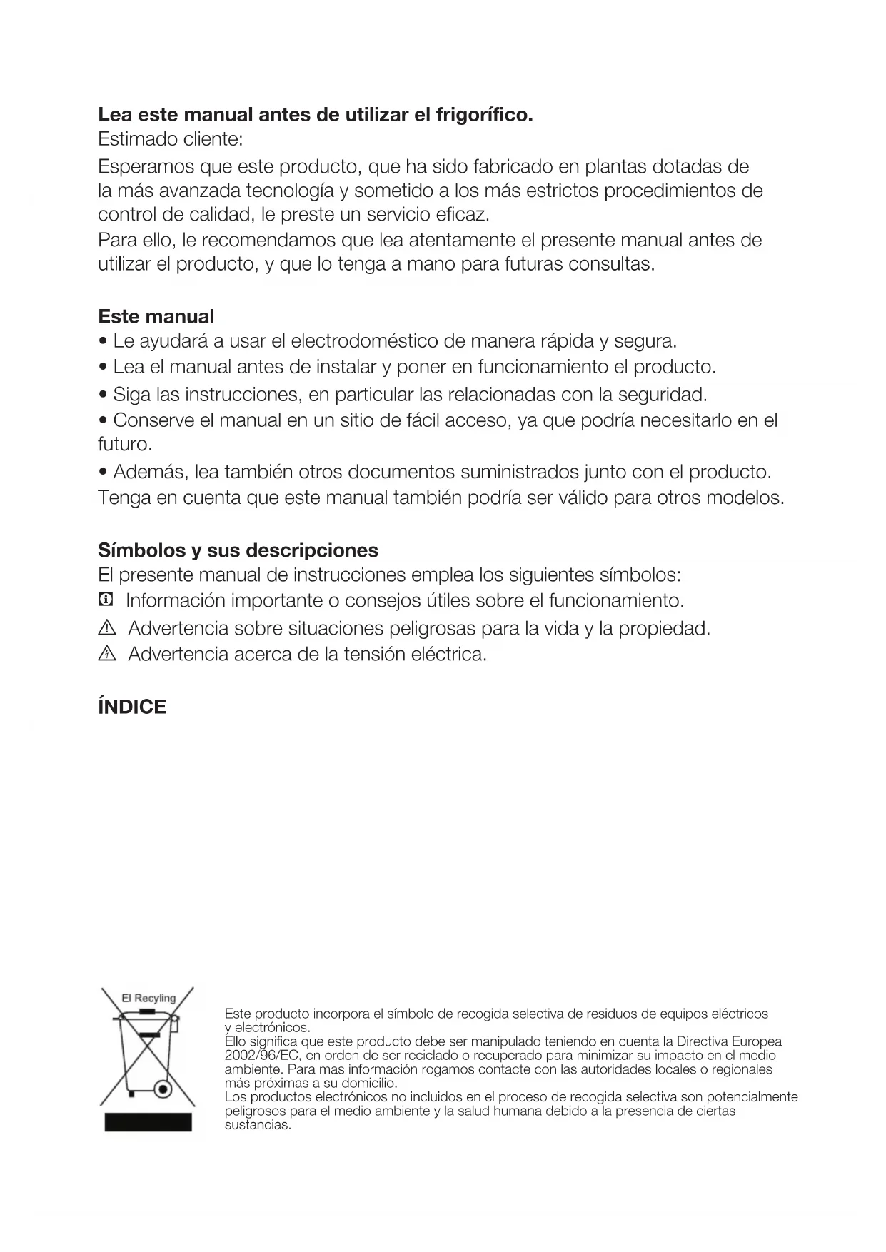 ÍNDICE Este producto incorpora el símbolo de recogida selectiva de residuos de equipos eléctricos