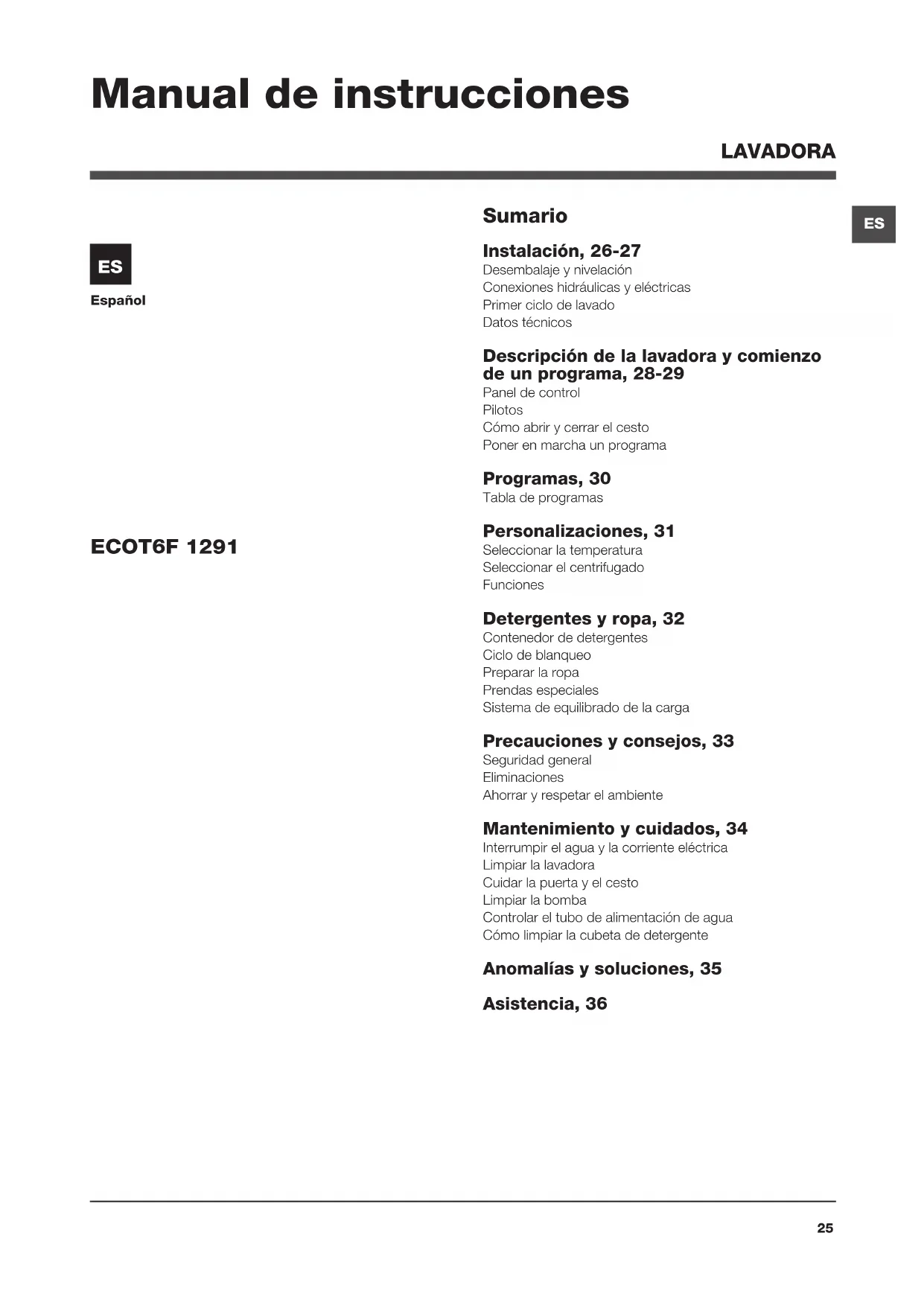 Español Sumario Instalación, 26-27 Desembalaje y nivelación Conexiones hidráulicas y eléctricas Primer ciclo de lavado Datos técnicos Descripción de la lavadora y comienzo de un programa, 28-29 Panel de control Pilotos Cómo abrir y cerrar el cesto Poner en marcha un programa Programas, 30 Tabla de programas Personalizaciones, 31 Seleccionar la temperatura Seleccionar el centrifugado Funciones Detergentes y ropa, 32 Contenedor de detergentes Ciclo de blanqueo Preparar la ropa Prendas especiales Sistema de equilibrado de la carga Precauciones y consejos, 33 Seguridad general Eliminaciones Ahorrar y respetar el ambiente Mantenimiento y cuidados, 34 Interrumpir el agua y la corriente eléctrica Limpiar la lavadora Cuidar la puerta y el cesto Limpiar la bomba Controlar el tubo de alimentación de agua Cómo limpiar la cubeta de detergente Anomalías y soluciones, 35 Asistencia, 36