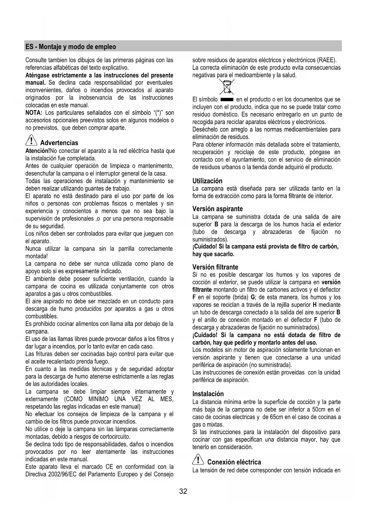 ¡Cuidado! Si la campana no está dotada de filtro de