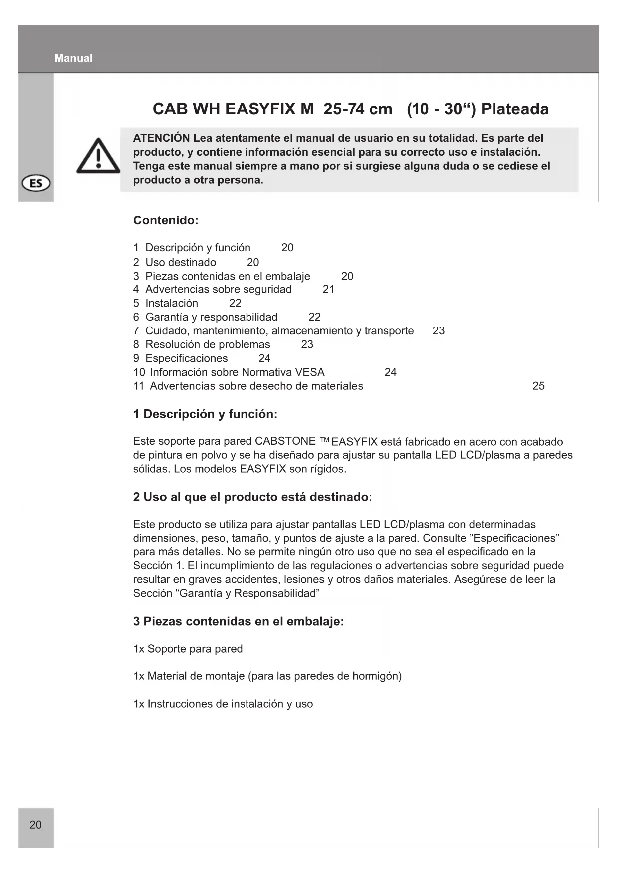 Este produit se utilizes paraaabstar pantallas LED LCD/plasma con determinadas dimensiones, peso,的时间里, y+puestos de ajuste a la pared.Consulte "Especificaciones" para mas detalles.No se permite ningun othero uso que no sea el especficado en la Seccion 1. El incumplimiento de las regulaciones o advertencias sobre seguridad可以更好 resultar en graves accidentes, lesiones yothers daños materiales. Asegúrese de leer la Seccion "Garantía y Responsabilidad"