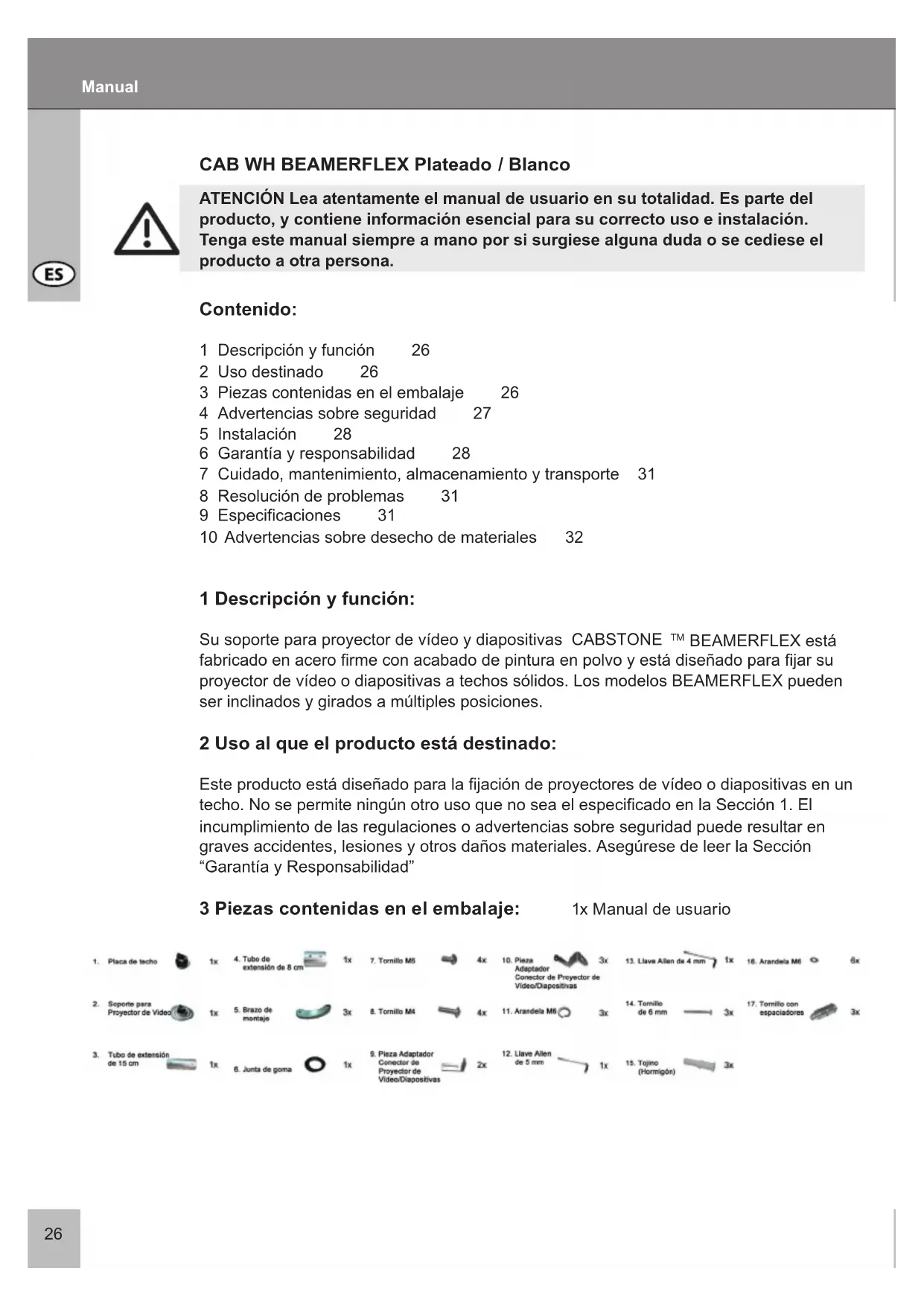 BEAMERFLEX está fabricado en acero rme con acabado de pintura en polvo y está diseñado para jar su proyector de vídeo o diapositivas a techos sólidos. Los modelos BEAMERFLEX pueden ser inclinados y girados a múltiples posiciones. 2 Uso al que el producto está destinado: Este producto está diseñado para la jación de proyectores de vídeo o diapositivas en un techo. No se permite ningún otro uso que no sea el especicado en la Sección 1. El incumplimiento de las regulaciones o advertencias sobre seguridad puede resultar en graves accidentes, lesiones y otros daños materiales. Asegúrese de leer la Sección “Garantía y Responsabilidad” 3 Piezas contenidas en el embalaje: 1x Manual de usuario27