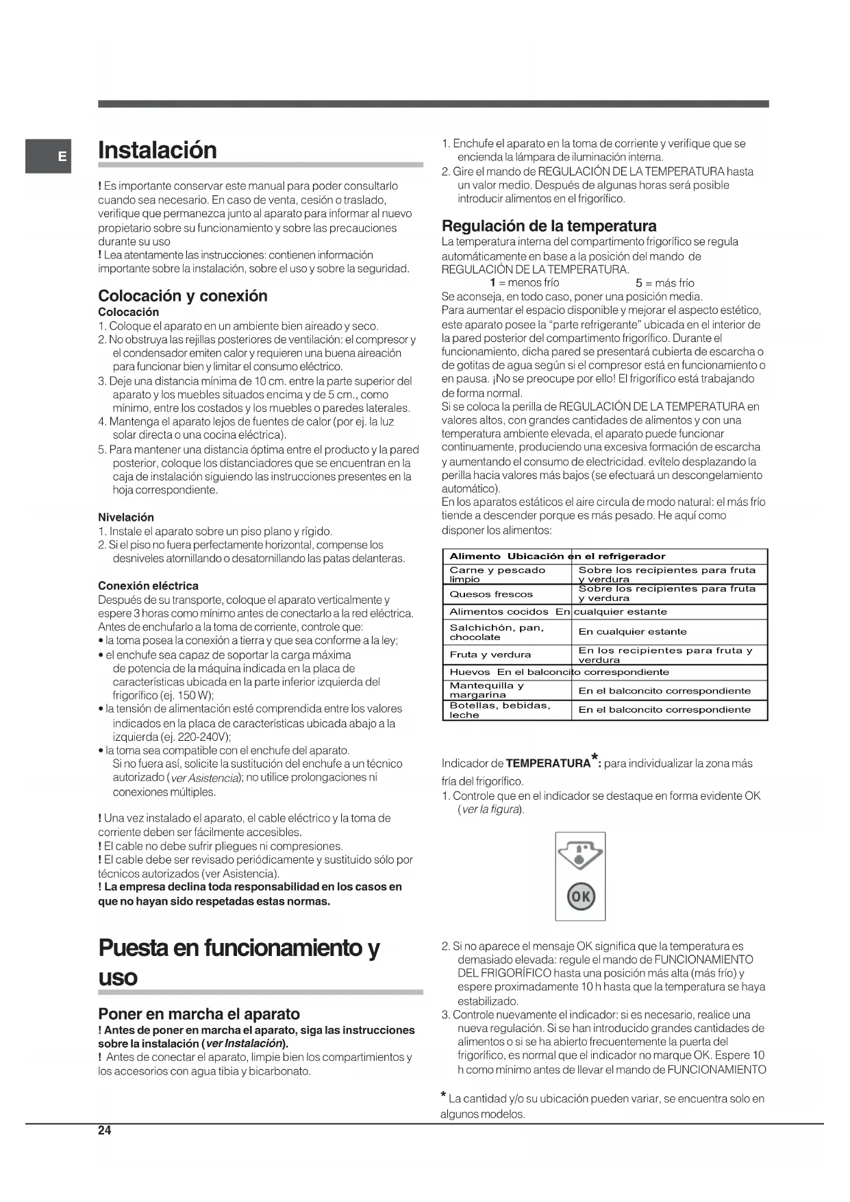 Indicador de TEMPERATURA*: para individualizar la zona más fría del frigorífico.1. Controle que en el indicador se destaque en forma evidente OK ( ver la figura ). 2. Si no aparece el mensaje OK significa que la temperatura esdemasiado elevada: regule el mando de FUNCIONAMIENTODEL FRIGORÍFICO hasta una posición más alta (más frío) yespere proximadamente 10 h hasta que la temperatura se hayaestabilizado.3. Controle nuevamente el indicador: si es necesario, realice unanueva regulación. Si se han introducido grandes cantidades dealimentos o si se ha abierto frecuentemente la puerta delfrigorífico, es normal que el indicador no marque OK. Espere 10h como mínimo antes de llevar el mando de FUNCIONAMIENTO * La cantidad y/o su ubicación pueden variar, se encuentra solo en algunos modelos.E