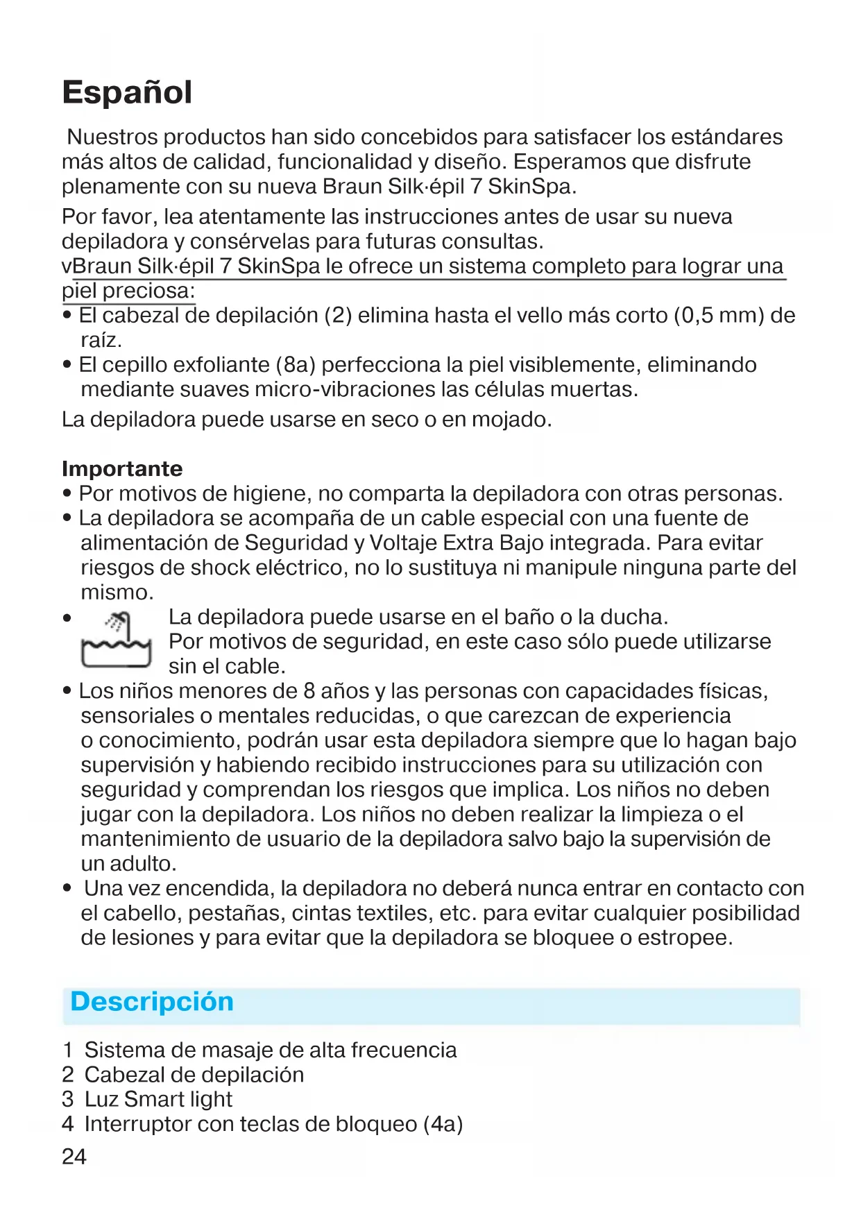 • Una vez encendida, la depiladora no deberá nunca entrar en contacto con