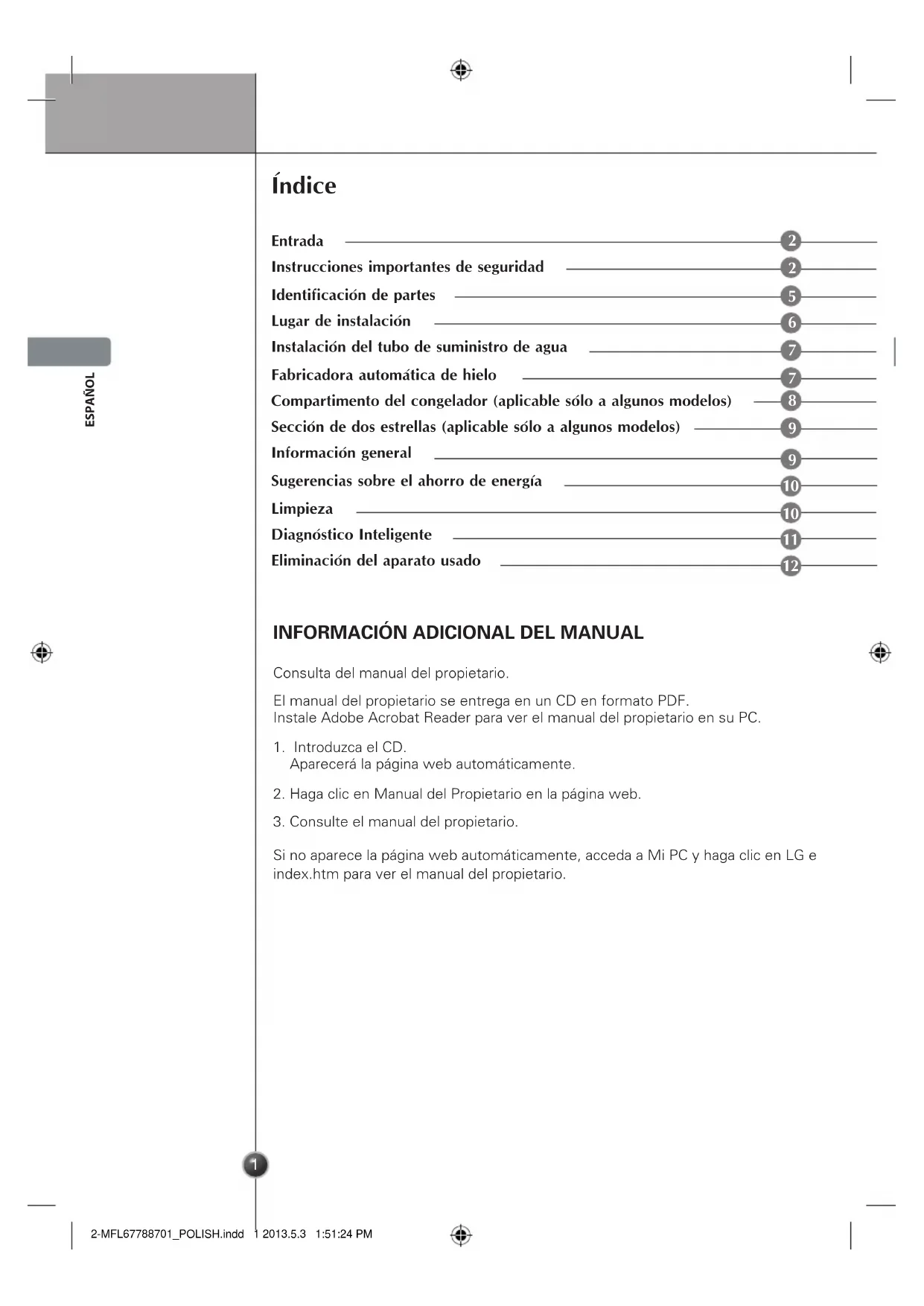 Consulta del manual del propietario.El manual del propietario se entrega en un CD en formato PDF. Instale Adobe Acrobat Reader para ver el manual del propietario en su PC.1. Introduzca el CD. Aparecerá la página web automáticamente.2. Haga clic en Manual del Propietario en la página web.3. Consulte el manual del propietario.Si no aparece la página web automáticamente, acceda a Mi PC y haga clic en LG e index.htm para ver el manual del propietario.