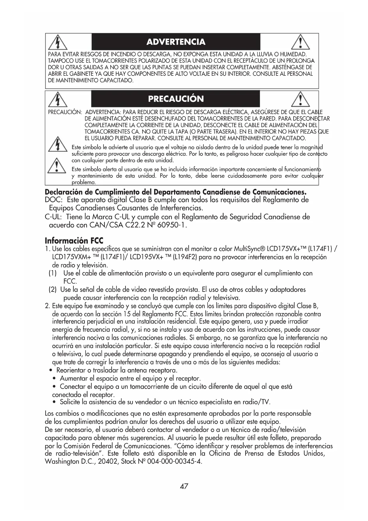tar en matière de rendement énergétique. Le logo EnErgy Star ne représente aucun aval par l’EPA de quelque produit ou service que ce soit. Série LCD NEC47 PRECAUCIÓN: ADVERTENCIA: PARA REDUCIR EL RIESGO DE DESCARGA ELÉCTRICA, ASEGÚRESE DE QUE EL CABLE DE ALIMENTACIÓN ESTÉ DESENCHUFADO DEL TOMACORRIENTES DE LA PARED. PARA DESCONECTAR COMPLETAMENTE LA CORRIENTE DE LA UNIDAD, DESCONECTE EL CABLE DE ALIMENTACIÓN DEL TOMACORRIENTES CA. NO QUITE LA TAPA (O PARTE TRASERA). EN EL INTERIOR NO HAY PIEZAS QUE EL USUARIO PUEDA REPARAR. CONSULTE AL PERSONAL DE MANTENIMIENTO CAPACITADO. Este símbolo le advierte al usuario que el voltaje no aislado dentro de la unidad puede tener la magnitud suficiente para provocar una descarga eléctrica. Por lo tanto, es peligroso hacer cualquier tipo de contacto con cualquier parte dentro de esta unidad. Este símbolo alerta al usuario que se ha incluido información importante concerniente al funcionamiento y mantenimiento de esta unidad. Por lo tanto, debe leerse cuidadosamente para evitar cualquier problema. ADVERTENCIA PRECAUCIÓN Declaración de Cumplimiento del Departamento Canadiense de Comunicaciones. DOC: Este aparato digital Clase B cumple con todos los requisitos del Reglamento de Equipos Canadienses Causantes de Interferencias. C-UL: Tiene la Marca C-UL y cumple con el Reglamento de Seguridad Canadiense de acuerdo con CAN/CSA C22.2 Nº 60950-1. Información FCC