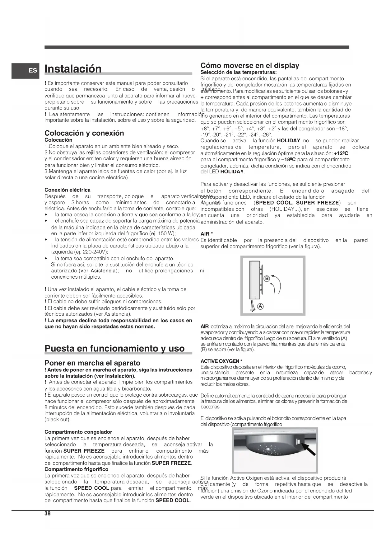 AIRoptimizaalmáximolacirculacióndelaire,mejorandolaeficienciadelevaporadorycontribuyendoaalcanzarconmayorrapidezlatemperaturaadecuadadentrodelfrigoríficoluegodesuabertura.Elaireventilado(A)seenfríaencontactoconlaparedfría,mientrasqueelairemáscaliente(B)seaspira(verlafigura).ACTIVE OXYGEN *Estedispositivodepositaenelinteriordelfrigoríficomoléculasdeozono,unasustancia presente enla naturaleza capazde atacar bacteriasymicroorganismosdisminuyendosuproliferacióndentrodelmismoydereducirlosmalosolores.Defineautomáticamentelacantidaddeozononecesariaparaprolongarlafrescuradelosalimentos,eliminarlosoloresyprevenirlaformacióndebacterias.Eldispositivoseactivapulsandoelbotoncitocorrespondienteenlatapadeldispositivo(compartimentofrigoríficoSilafunciónActiveOxigenestáactiva,eldispositivoproducirácíclicamente(y de forma repetitivahastaque se desactivelafunción)unaemisióndeOzonoindicadaporelencendidodelledverdeeneldispositivoubicadoenelinteriordelcompartimentoES