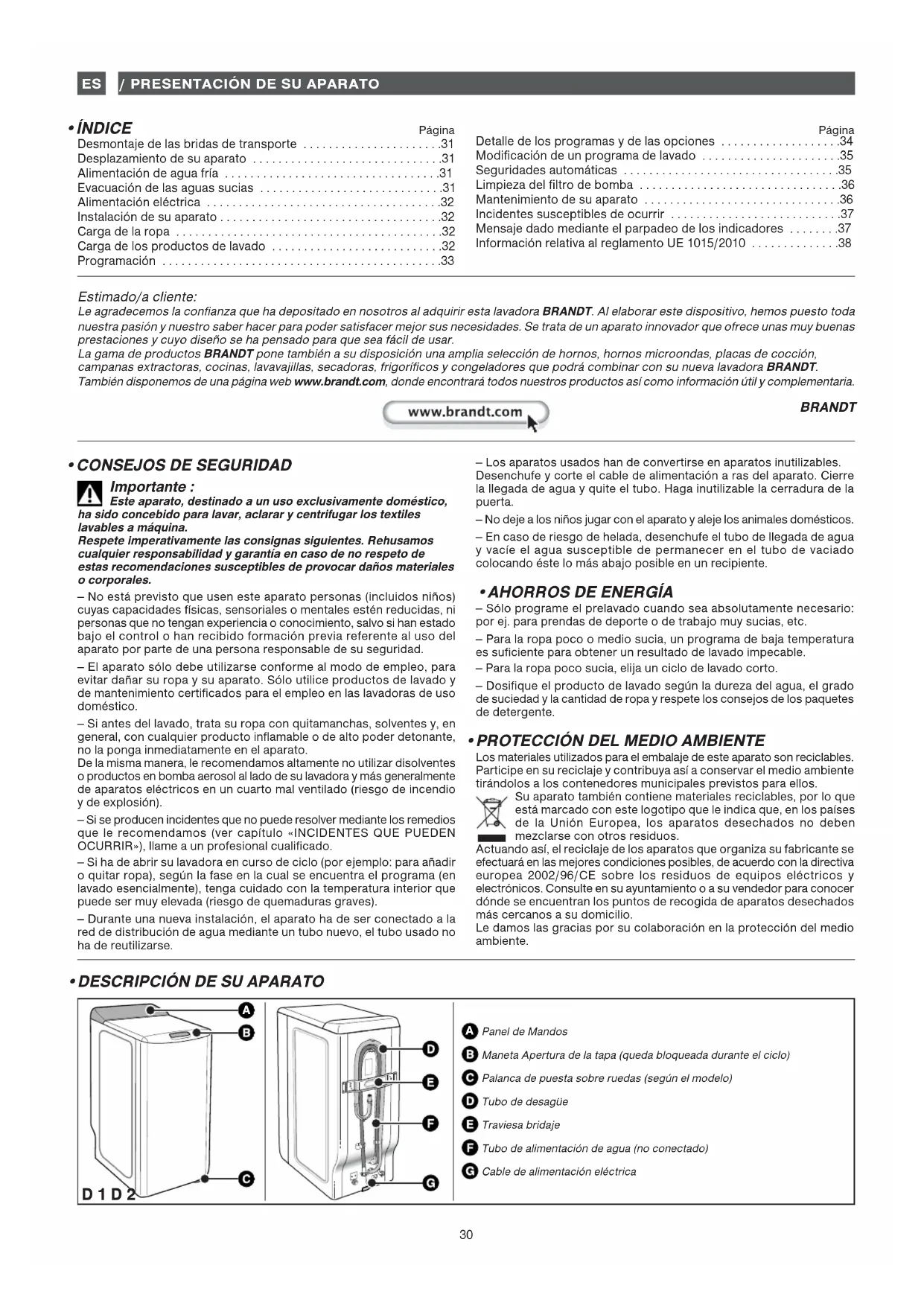 Le agradecemos la confianza que ha depositado en nosotros al adquirir esta lavadora BRANDT. Al elaborar este dispositivo, hemos puesto toda