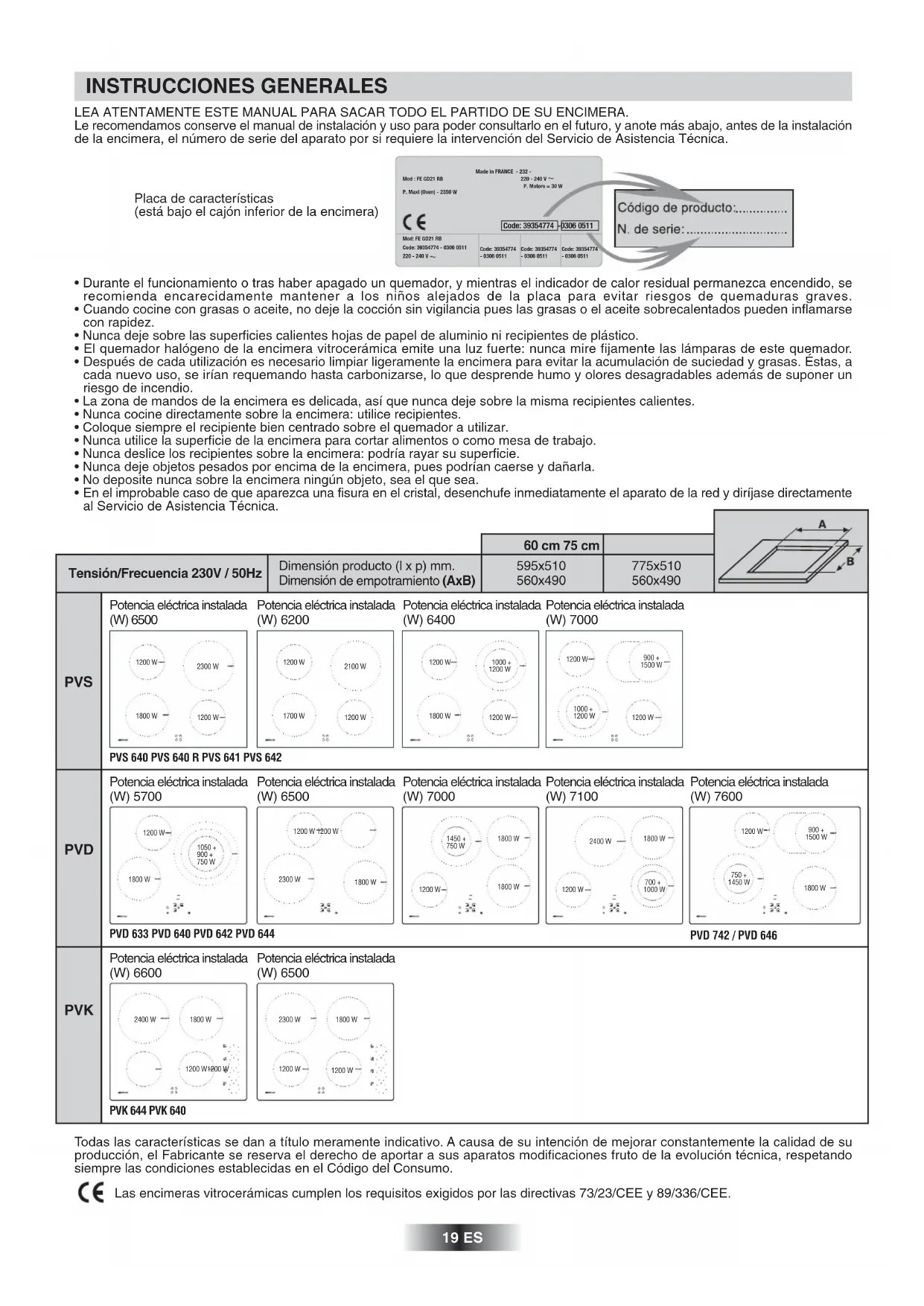 Las encimeras vitrocerámicas cumplen los requisitos exigidos por las directivas 73/23/CEE y 89/336/CEE. Made in FRANCE - 232 -220 - 240 V P. Motors = 30 WMod : FE GD21 RBP. Maxi (Oven) - 2350 W Code: 39354774 -0306 0511 Mod: FE GD21 RBCode: 39354774 - 0306 0511220 - 240 VCode: 39354774- 0306 0511Code: 39354774- 0306 0511Code: 39354774- 0306 0511 Placa de características