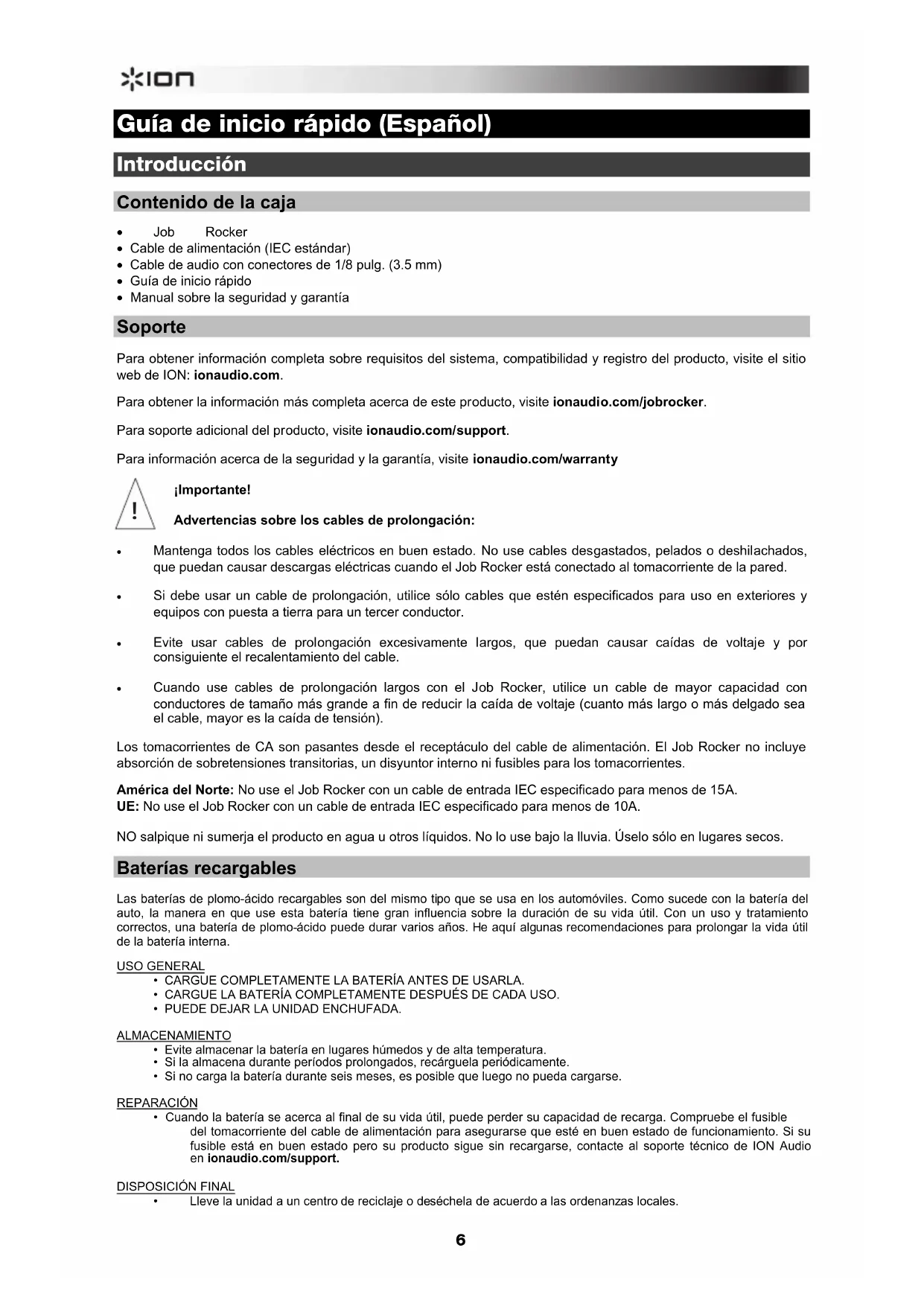 - Cuando use cables de prolongación largos con el Job Rocker, utilice un cable de mayor capacidad con conductores de tamaño más grande a fin de reducir la caída de voltaje (cuanto más largo o más delgado sea el cable, mayor es la caída de tensión). Los tomacorrientes de CA son pasantes desde el receptáculo del cable de alimentación. El Job Rocker no incluye absorción de sobretensiones transitorias, un disyuntor interno ni fusibles para los tomacorrientes. América del Norte: No use el Job Rocker con un cable de entrada IEC especificado para menos de 15A. UE: No use el Job Rocker con un cable de entrada IEC especificado para menos de 10A. NO salpique ni sumerja el producto en agua u otros líquidos. No lo use bajo la lluvia. Úselo sólo en lugares secos. Baterías recargables Las baterías de plomo-ácido recargables son del mismo tipo que se usa en los automóviles. Como sucede con la batería del auto, la manera en que use esta batería tiene gran influencia sobre la duración de su vida útil. Con un uso y tratamiento correctos, una batería de plomo-ácido puede durar varios años. He aquí algunas recomendaciones para prolongar la vida útil de la batería interna. USO GENERAL • CARGUE COMPLETAMENTE LA BATERÍA ANTES DE USARLA. • CARGUE LA BATERÍA COMPLETAMENTE DESPUÉS DE CADA USO. • PUEDE DEJAR LA UNIDAD ENCHUFADA. ALMACENAMIENTO • Evite almacenar la batería en lugares húmedos y de alta temperatura. • Si la almacena durante períodos prolongados, recárguela periódicamente. • Si no carga la batería durante seis meses, es posible que luego no pueda cargarse. REPARACIÓN • Cuando la batería se acerca al final de su vida útil, puede perder su capacidad de recarga. Compruebe el fusible del tomacorriente del cable de alimentación para asegurarse que esté en buen estado de funcionamiento. Si su fusible está en buen estado pero su producto sigue sin recargarse, contacte al soporte técnico de ION Audio en ionaudio.com/support.