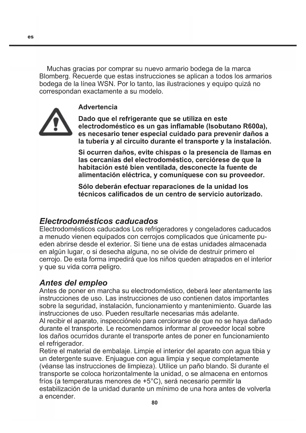 Reclamatie, reservedelen en service79 Neem de geldende milieubepalingen in acht. De gemeentelijke technische dienst kan u vertellen hoe het ophalen/afleveren en hergebruik van dergelijke kasten in uw gemeente gebeurt. Dit apparaat is voorzien van het merkteken volgens de Europese richtlijn 2002/96/ EG inzake Afgedankte elektrische en elektronische apparaten (AEEA). Door ervoor te zorgen dat dit product op de juiste manier als afval wordt verwerkt, helpt u mogelijk negatieve consequenties voor het milieu en de menselijke gezondheid te voorkomen die anders zouden kunnen worden veroorzaakt door onjuiste verwerking van dit product als afval. Het symbool op het product of op de bijbehorende documentatie geeft aan dat dit product niet als huishoudelijk afval mag worden behandeld. In plaats daarvan moet het worden afgegeven bij een verzamelpunt voor recycling van elektrische en elektronische apparaten. Afdanking moet worden uitgevoerd in overeenstemming met de plaatselijke milieuvoorschriften voor afvalverwerking. Voor nadere informatie over de behandeling, terugwinning en recycling van dit product wordt u verzocht contact op te nemen met het stadskantoor in uw woonplaats, uw afvalophaaldienst of de winkel waar u het product heeft aangeschaft. Verschroten80 Muchas gracias por comprar su nuevo armario bodega de la marca Blomberg. Recuerde que estas instrucciones se aplican a todos los armarios bodega de la línea WSN. Por lo tanto, las ilustraciones y equipo quizá no correspondan exactamente a su modelo. Advertencia Dado que el refrigerante que se utiliza en este electrodoméstico es un gas inflamable (Isobutano R600a), es necesario tener especial cuidado para prevenir daños a la tubería y al circuito durante el transporte y la instalación. Si ocurren daños, evite chispas o la presencia de llamas en las cercanías del electrodoméstico, cerciórese de que la habitación esté bien ventilada, desconecte la fuente de alimentación eléctrica, y comuníquese con su proveedor. Sólo deberán efectuar reparaciones de la unidad los técnicos calificados de un centro de servicio autorizado. Electrodomésticos caducados Electrodomésticos caducados Los refrigeradores y congeladores caducados a menudo vienen equipados con cerrojos complicados que únicamente pu- eden abrirse desde el exterior. Si tiene una de estas unidades almacenada en algún lugar, o si desecha alguna, no se olvide de destruir primero el cerrojo. De esta forma impedirá que los niños queden atrapados en el interior y que su vida corra peligro. Antes del empleo Antes de poner en marcha su electrodoméstico, deberá leer atentamente las instrucciones de uso. Las instrucciones de uso contienen datos importantes sobre la seguridad, instalación, funcionamiento y mantenimiento. Guarde las instrucciones de uso. Pueden resultarle necesarias más adelante. Al recibir el aparato, inspecciónelo para cerciorarse de que no se haya dañado durante el transporte. Le recomendamos informar al proveedor local sobre los daños ocurridos durante el transporte antes de poner en funcionamiento el refrigerador. Retire el material de embalaje. Limpie el interior del aparato con agua tibia y un detergente suave. Enjuague con agua limpia y seque completamente (véanse las instrucciones de limpieza). Utilice un paño blando. Si durante el transporte se coloca horizontalmente la unidad, o se almacena en entornos fríos (a temperaturas menores de +5°C), será necesario permitir la estabilización de la unidad durante un mínimo de una hora antes de volverla a encender. es81 Conozca su armario bodega Iluminación Filtro de carbón Bandeja de madera Burlete Placa del fabricante Tirador de la puerta Placa de base Panel de control Cerrojo Patas ajustables Figura 182 Ubicación Por motivos de seguridad y funcionamiento, no se debe instalar el aparato en exteriores. Se recomienda colocar el aparato sobre una superficie plana en una habitación seca, y bien ventilada (con un 75% máx. de humedad relativa del aire). Nunca lo coloque cerca de fuentes de calor tales como estufas o radiadores, y evite colocarlo bajo la luz solar directa. Temperatura ambiente La clase de clima se indica en la placa del fabricante (véase la fig. 1, página 81 y la fig. 11, página 91). Este cuadro especifica las temperaturas ambiente óptimas. No obstante, los armarios bodega en posición de invierno funcionan a una temperatura ambiente de, como mínimo, 5º. Instalación La superficie sobre la cual se coloque el electrodoméstico debe estar nivelada. No use tarimas o similares. Se puede instalar el aparato como unidad autónoma junto a la pared, integrado en un elemento de la cocina, o alineado con otros electrodomésticos (figs. 2 y 3). Instalación y puesta en marcha inicial